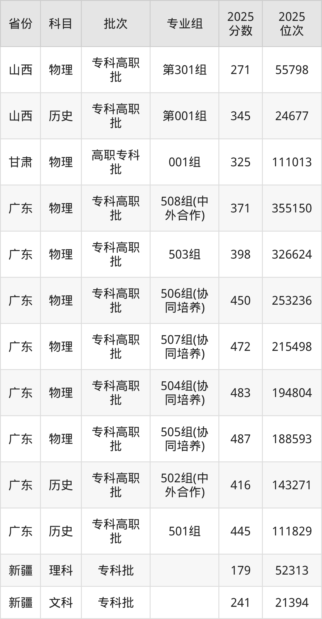 广东职业技术学院001专业组:2025年投档录取最低分为325分。