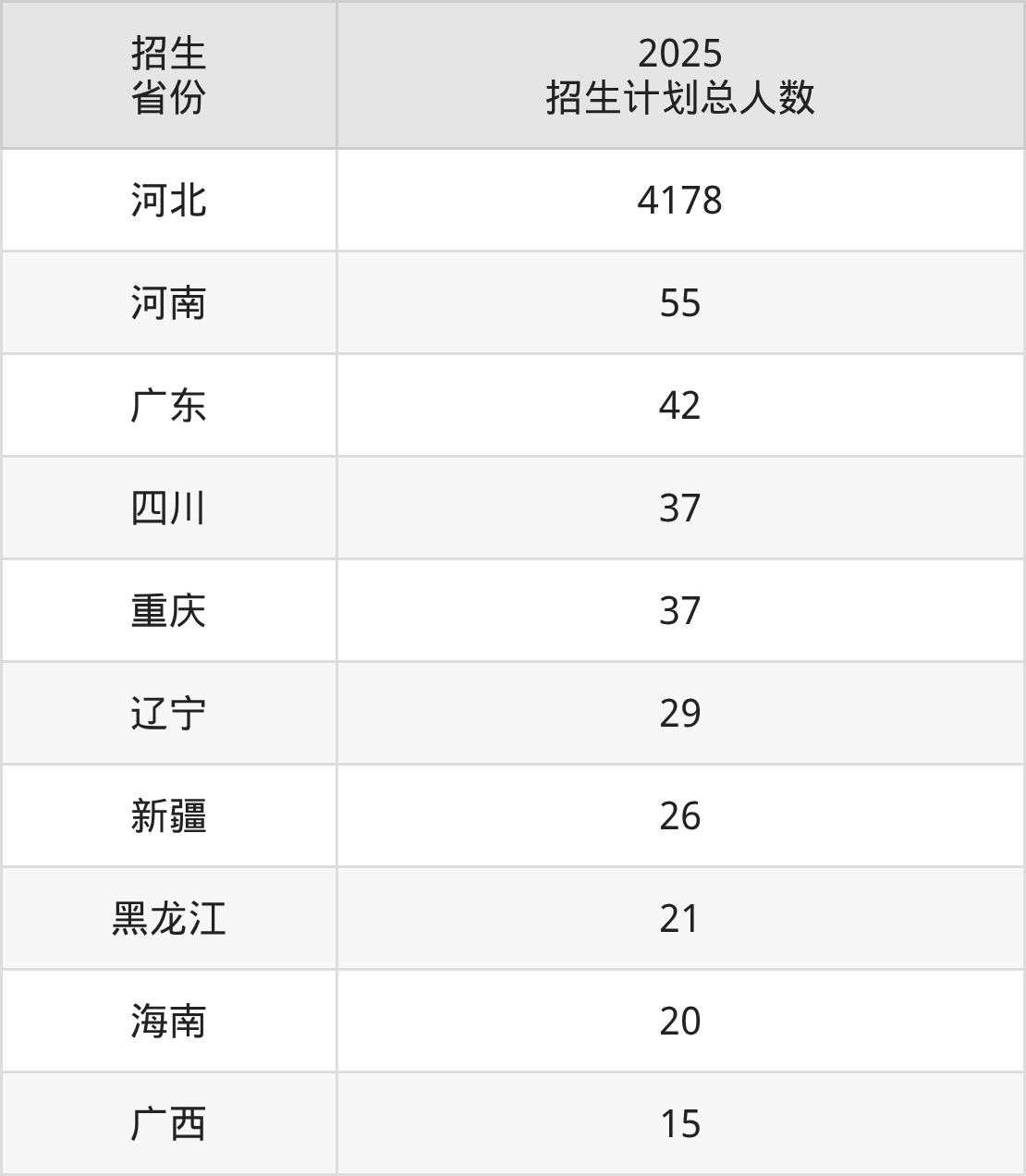 2025年邢台医学院面向全国10个省市开展本科招生;招生专业共7个,招生人数共1479人。2025年在河北省招生计划总人数是4178人,其中,邢台医学院在河北省招生人数最多的是护理。邢台医学院在各省具体招生人数情况如下表。