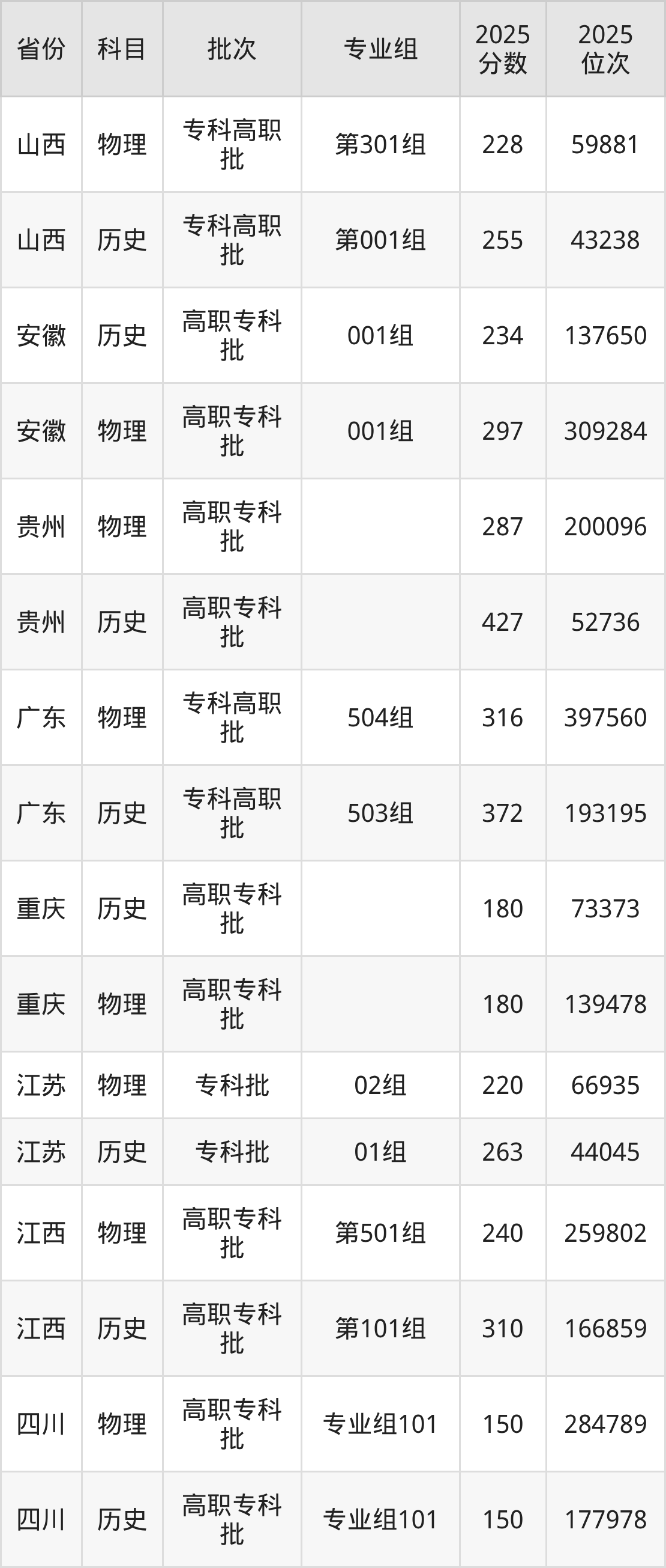 普通类专科历史类最低180分,专科物理类最低180分