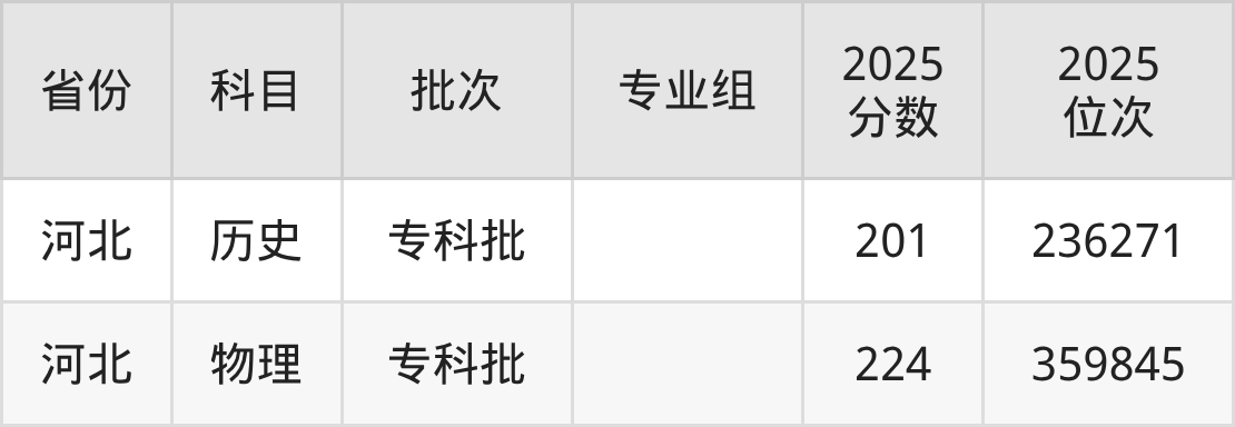 专科历史类投档录取最低201分,专科物理类投档录取最低224分