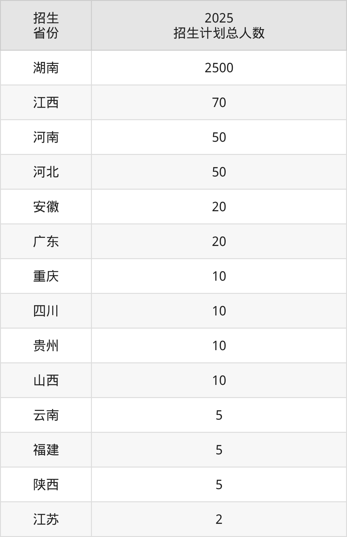 2025年湖南外国语职业学院面向全国14个省市开展专科招生;招生专业共36个,招生人数共2767人。2025年在湖南省招生计划总人数是2500人,其中,湖南外国语职业学院在湖南省招生人数最多的是护理。湖南外国语职业学院在各省具体招生人数情况如下表。