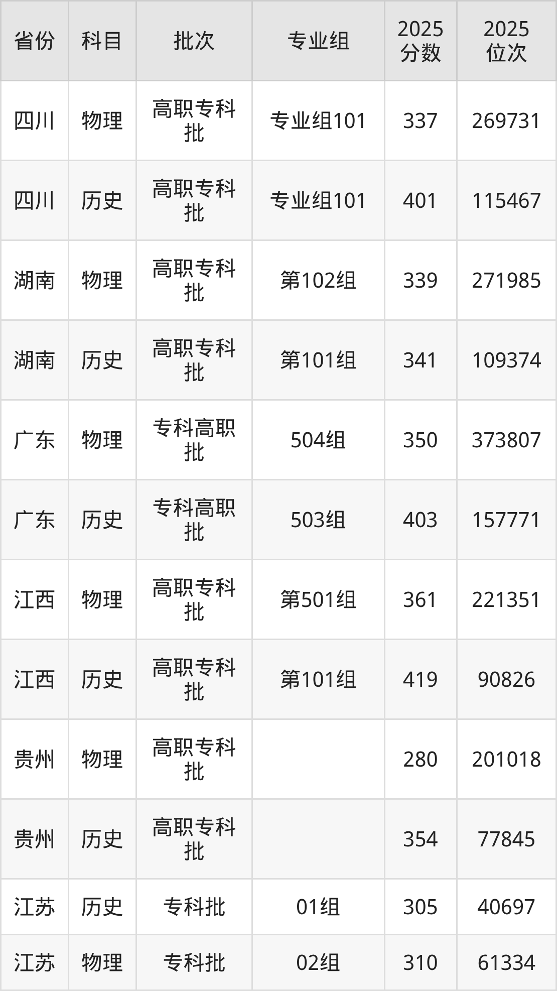 邵阳工业职业技术学院专业组101:2025年投档录取最低分为337分,录取最低位次为269731名。