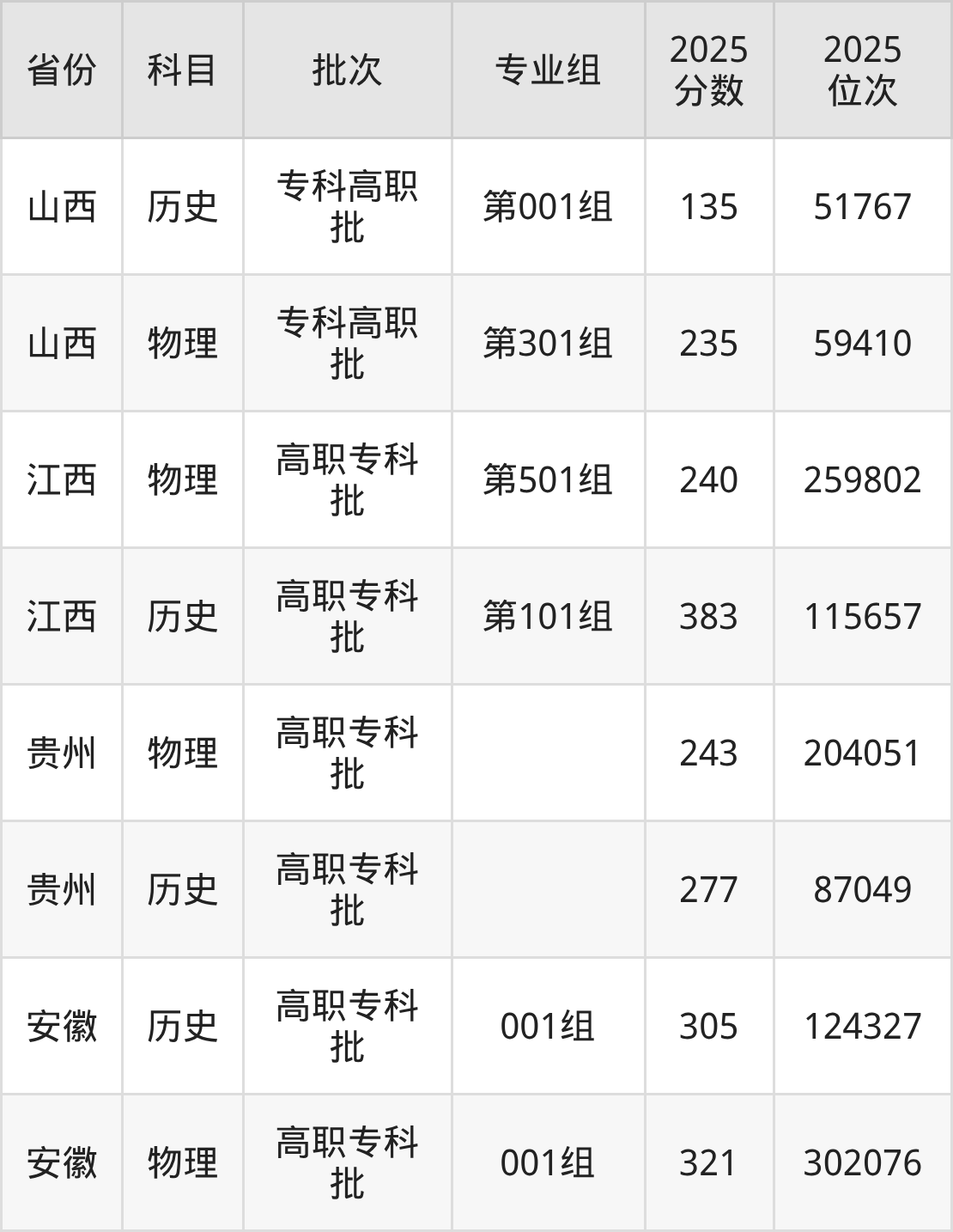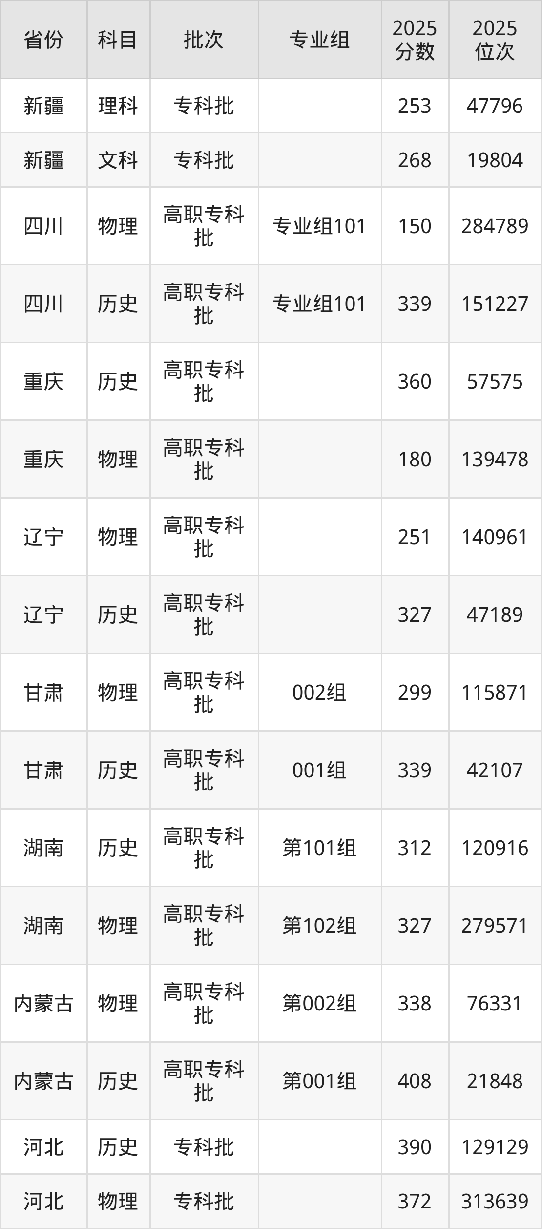 普通类专科物理类最低251分,专科历史类最低327分
