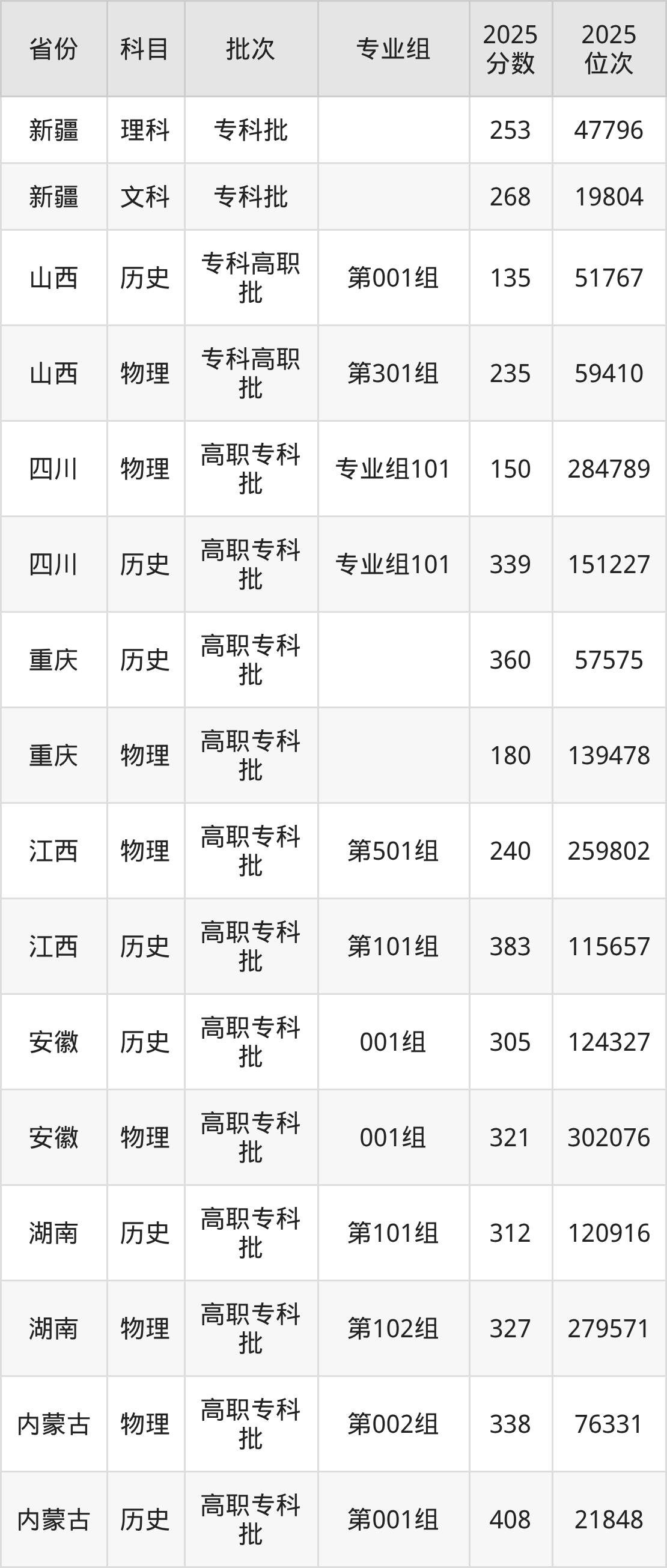 普通类专科历史类最低305分,专科物理类最低321分