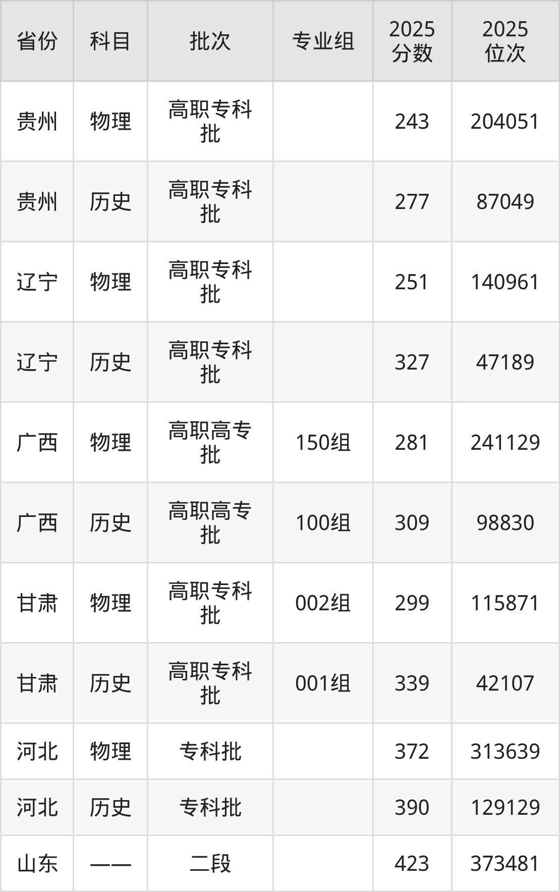 普通类专科历史类最低339分,专科物理类最低150分
