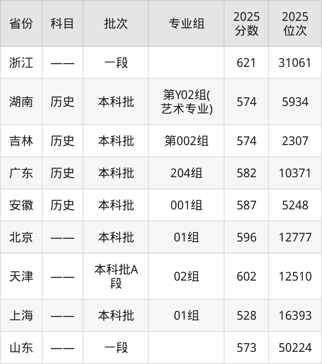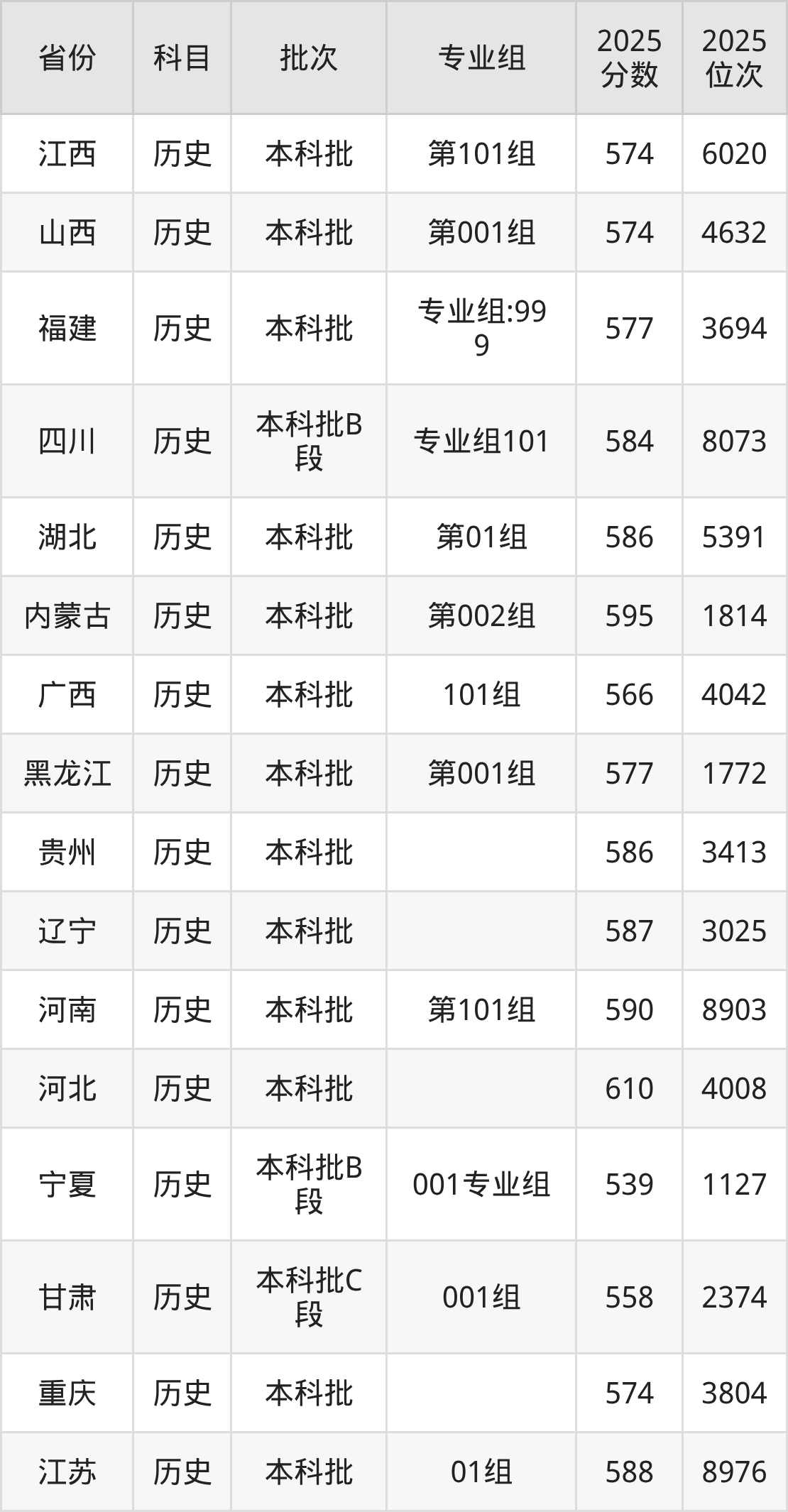 2025年在本科历史类进行招生,各专业组分数线详情如下: