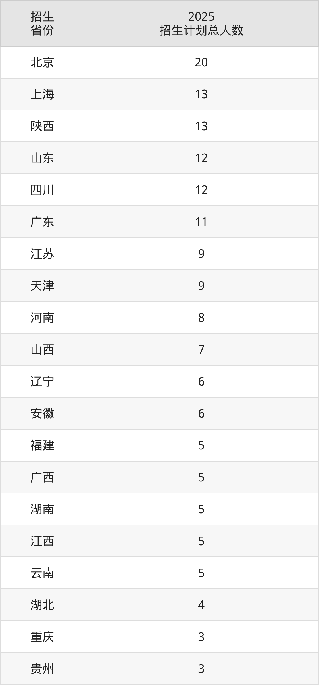 2025年中央戏剧学院面向全国26个省市开展本科招生;招生专业共4个,招生人数共170人。2025年在北京市招生计划总人数是20人,其中,中央戏剧学院在北京市招生人数最多的是戏剧影视文学。中央戏剧学院在各省具体招生人数情况如下表。
