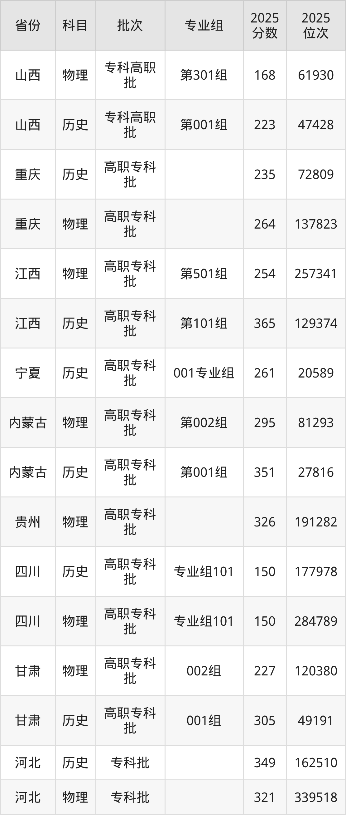 2025年在专科物理类进行招生,各专业组分数线详情如下: