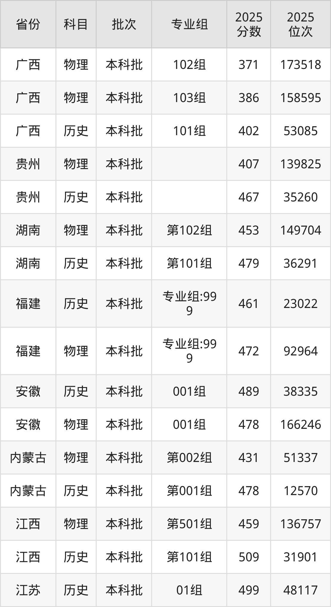 2025年湖北经济学院法商学院全国录取分数线是371分到537分,录取最低在广西物理类(102组)、录取最高在海南(专业组01)。各省各专业组最低分具有差异,详情如下: