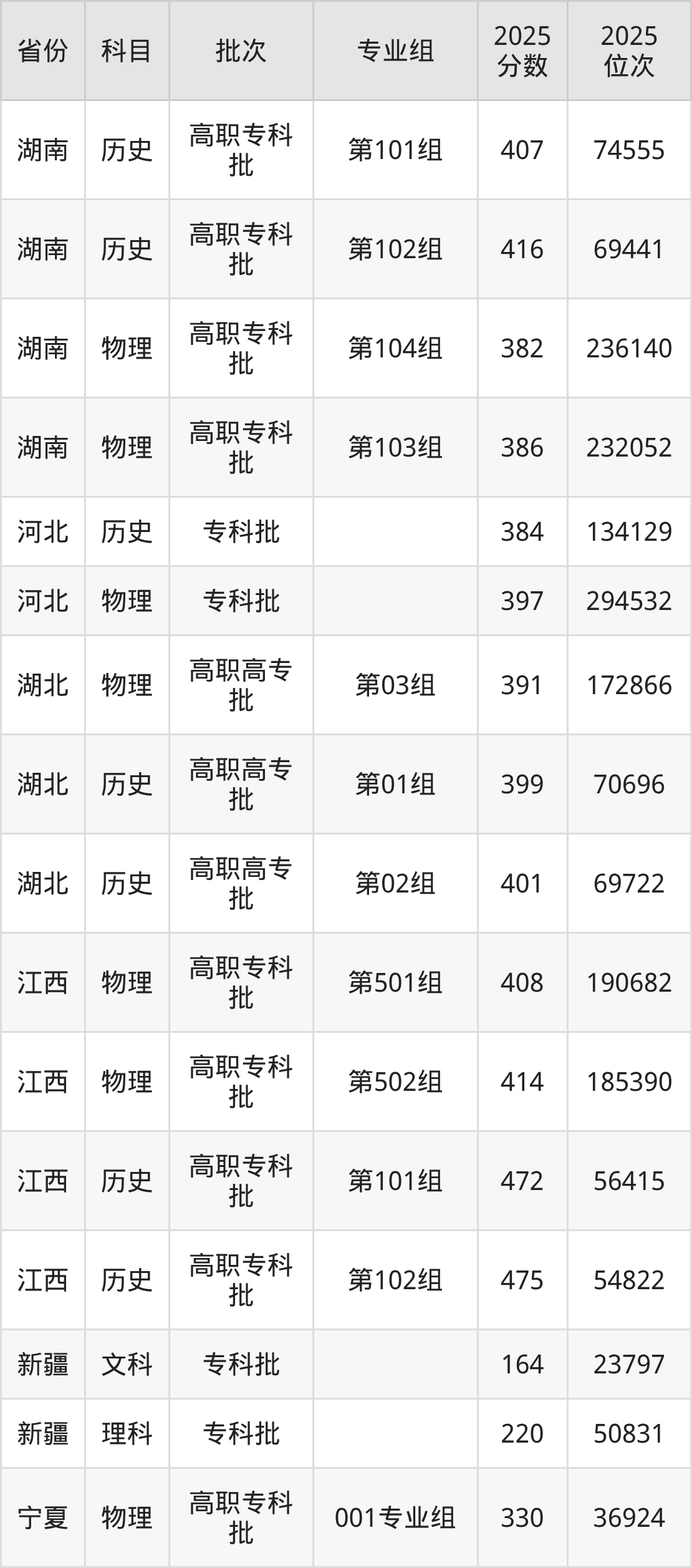 普通类专科物理类最低382分,专科历史类最低407分