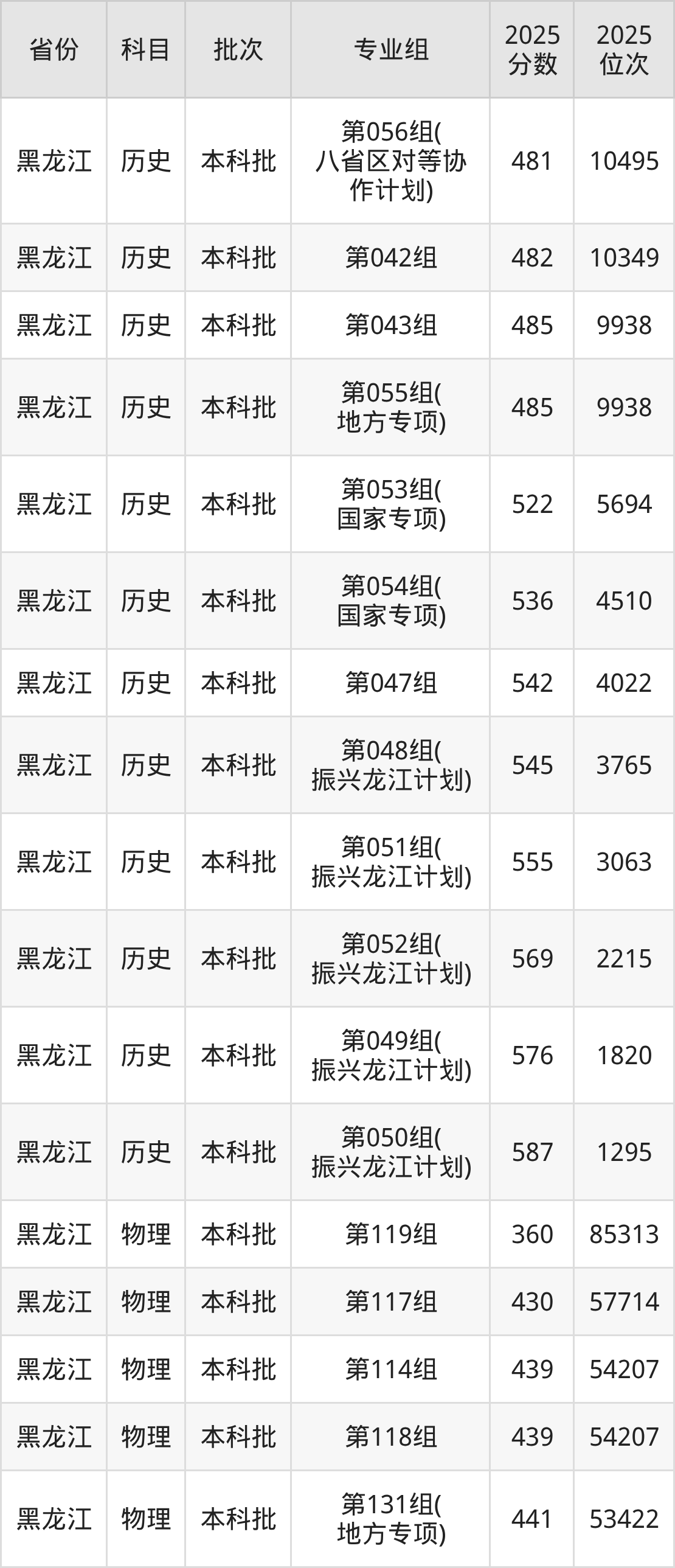 哈尔滨师范大学第056组(八省区对等协作计划):2025年投档录取最低分为481分,录取最低位次为10495名。