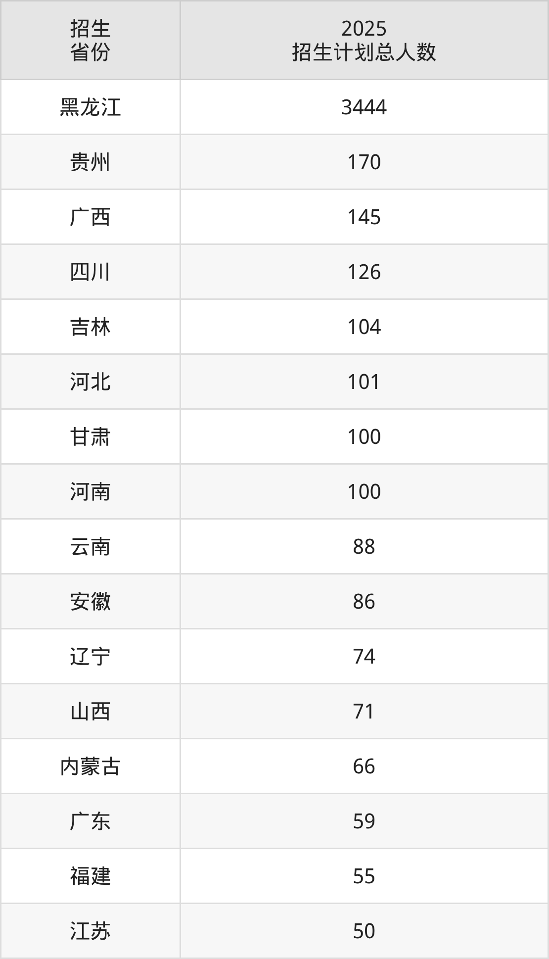 2025年哈尔滨师范大学面向全国27个省市开展本科招生;招生专业共50个,招生人数共5057人。2025年在黑龙江省招生计划总人数是3444人,其中,哈尔滨师范大学在黑龙江省招生人数最多的是汉语言文学。哈尔滨师范大学在各省具体招生人数情况如下表。