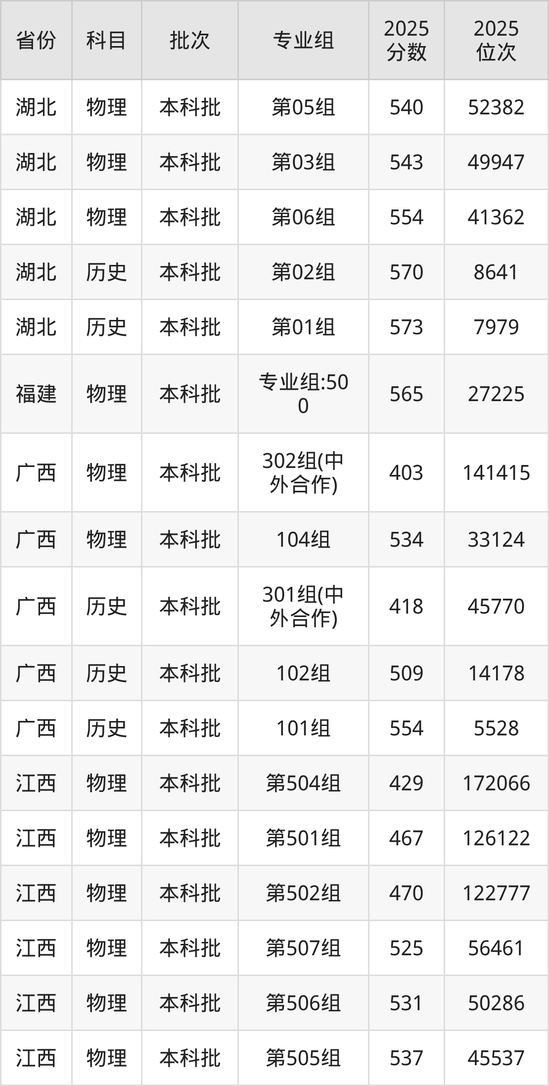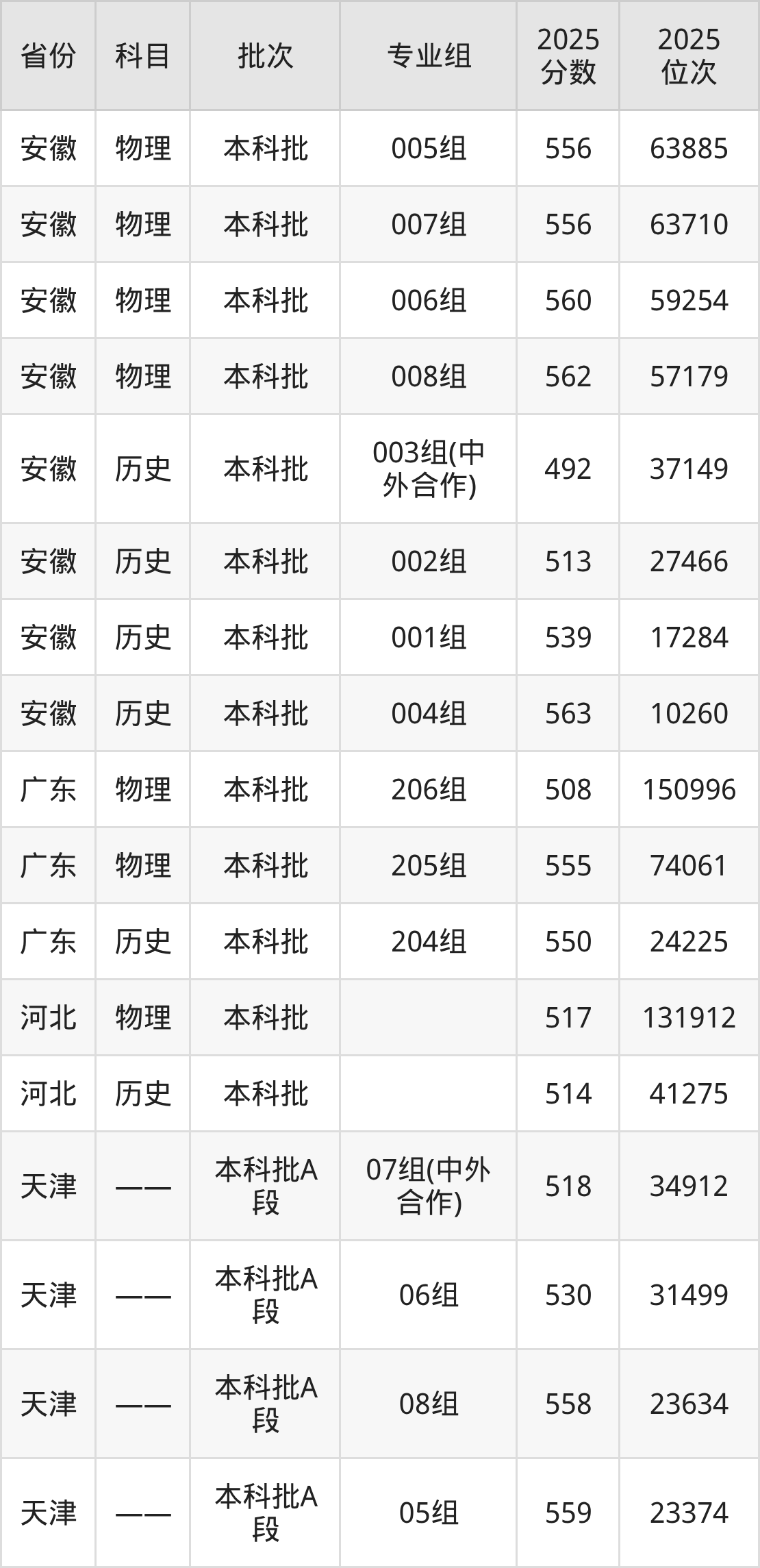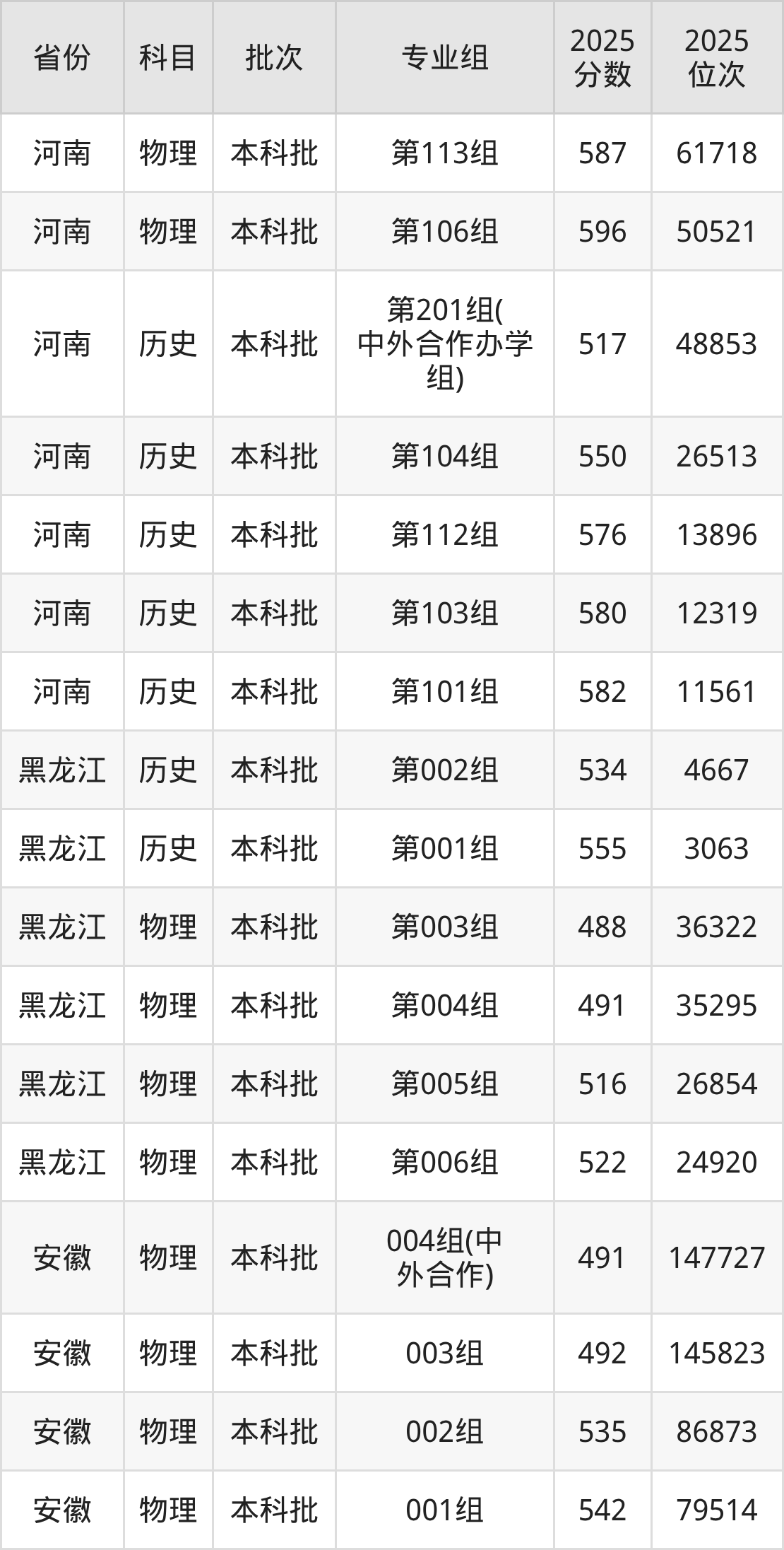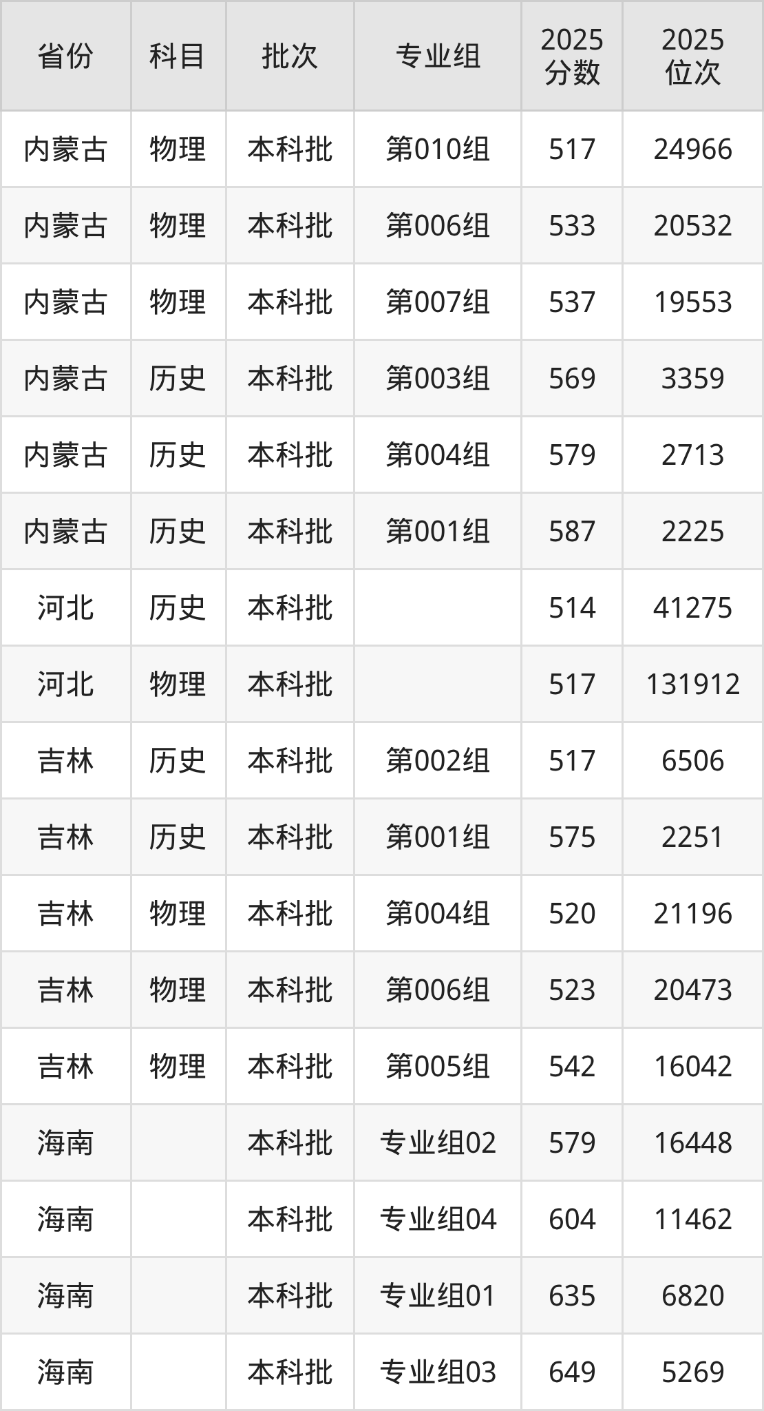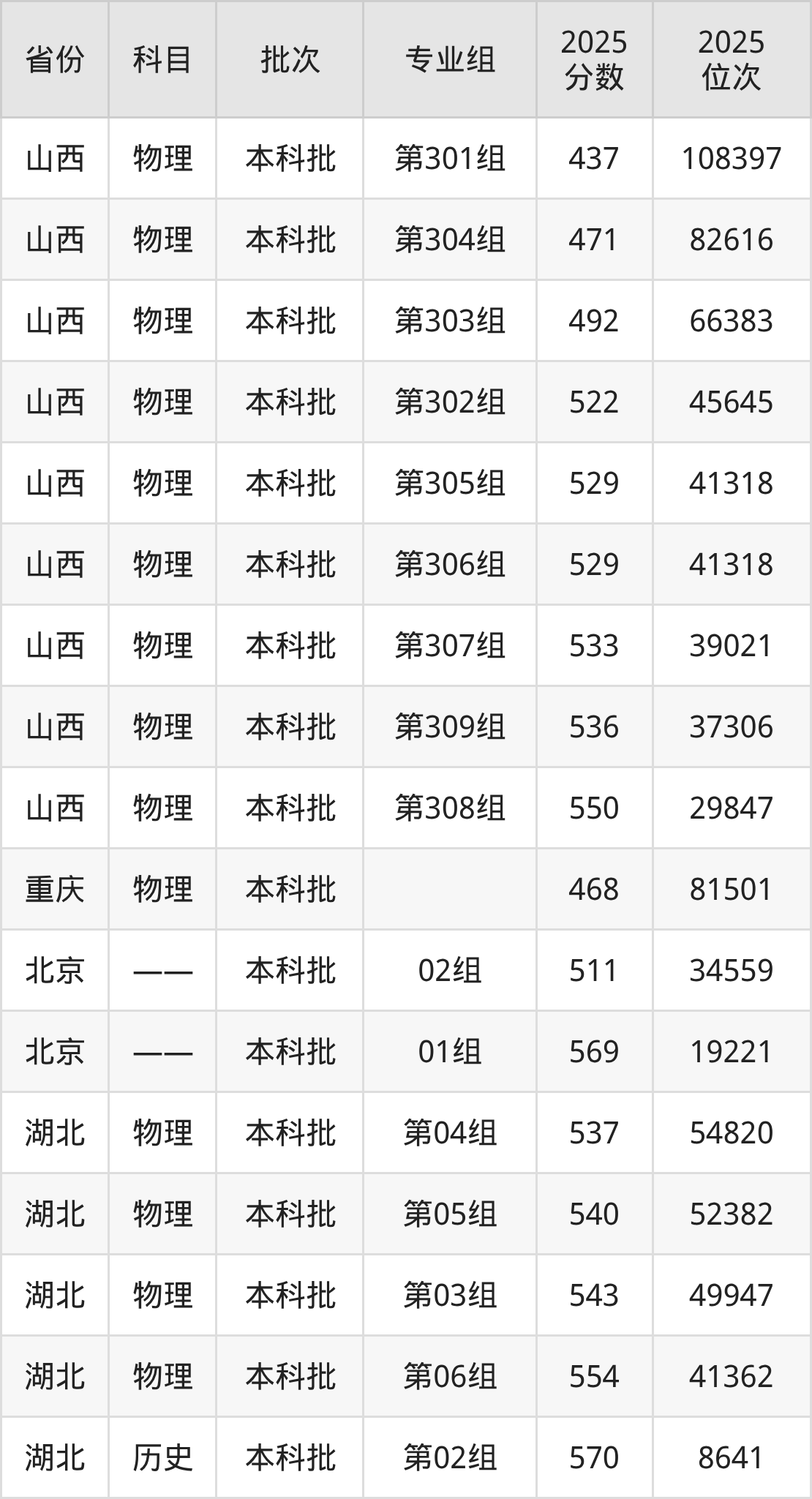 2025年在本科物理类进行招生,各专业组分数线详情如下: