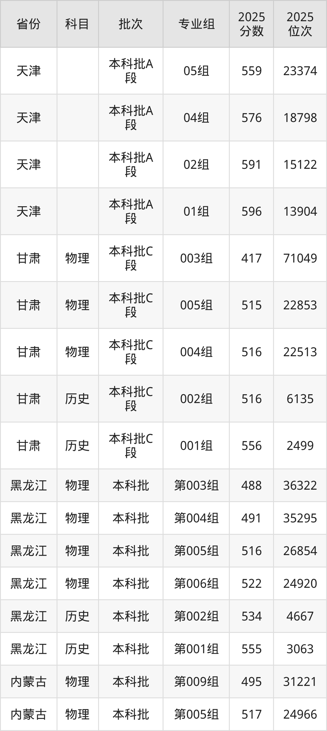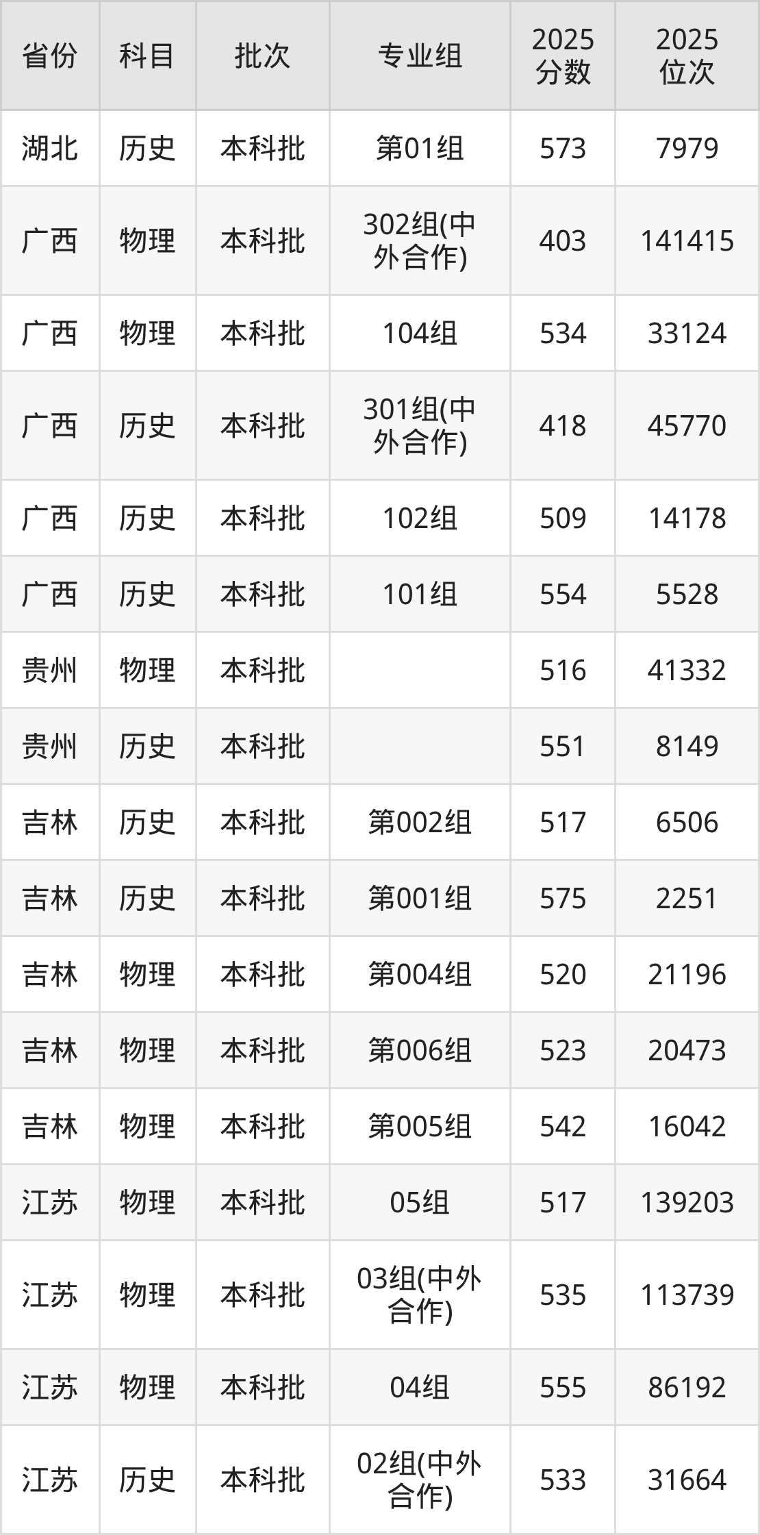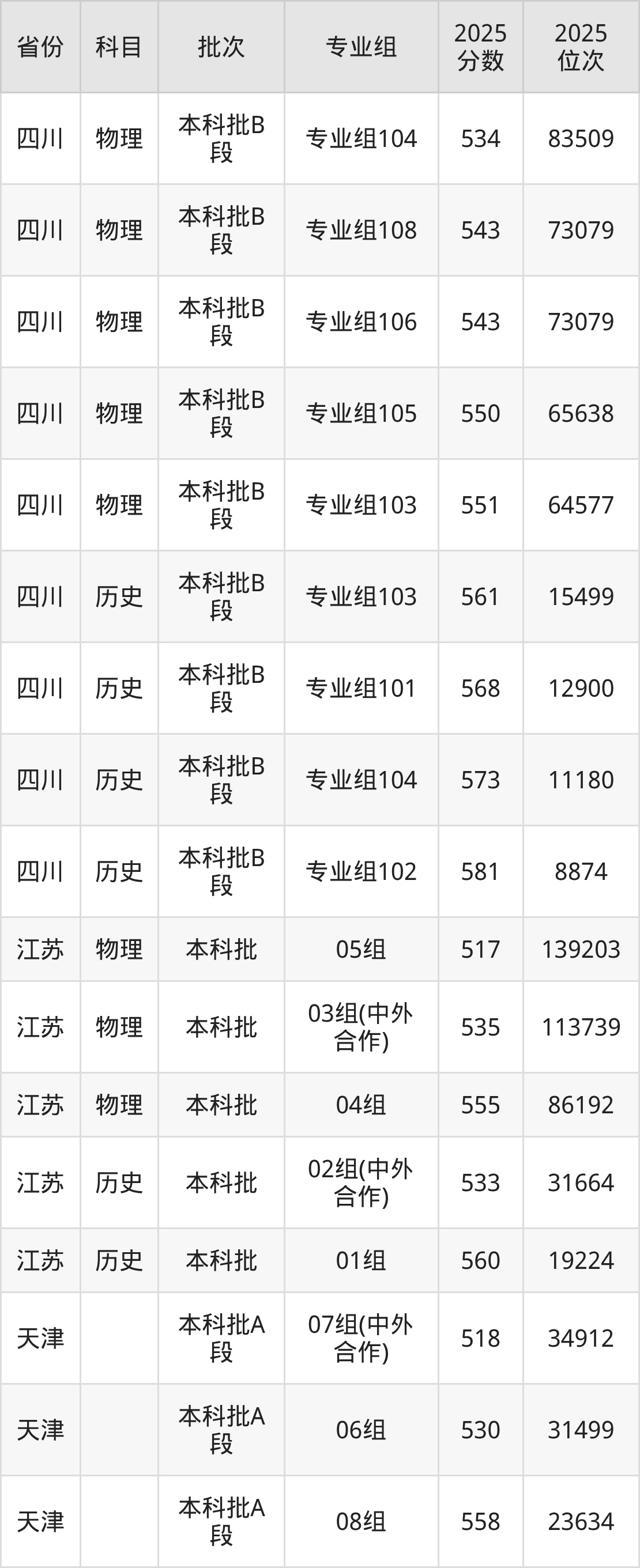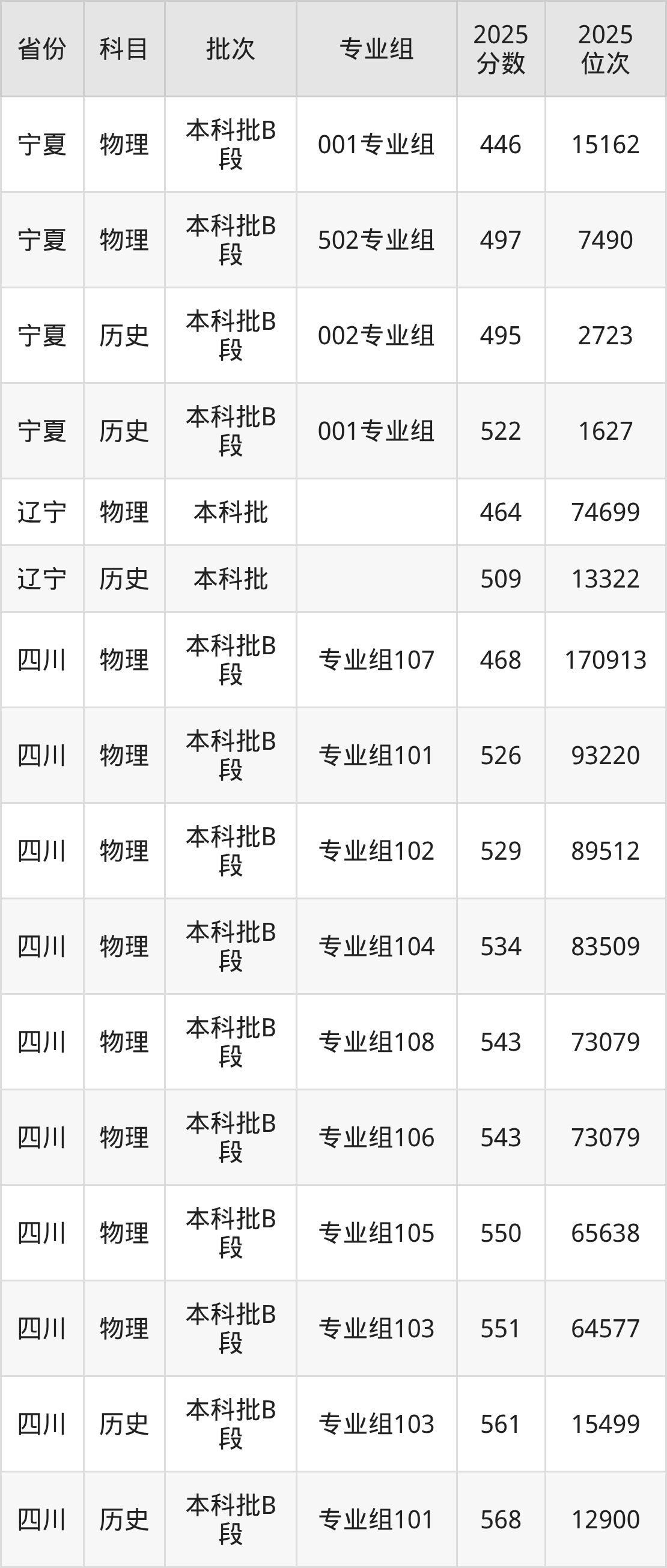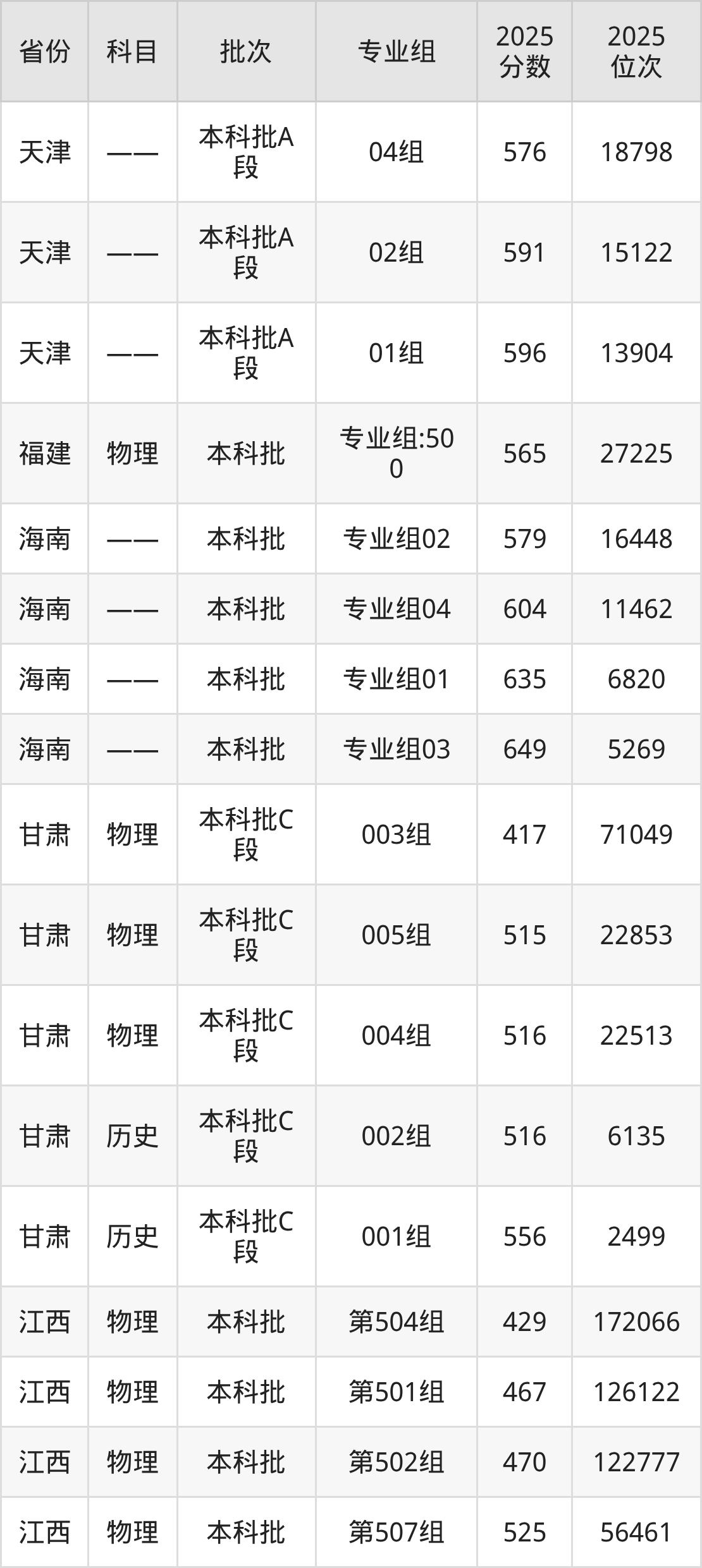 2025年在本科物理类进行招生,各专业组分数线详情如下: