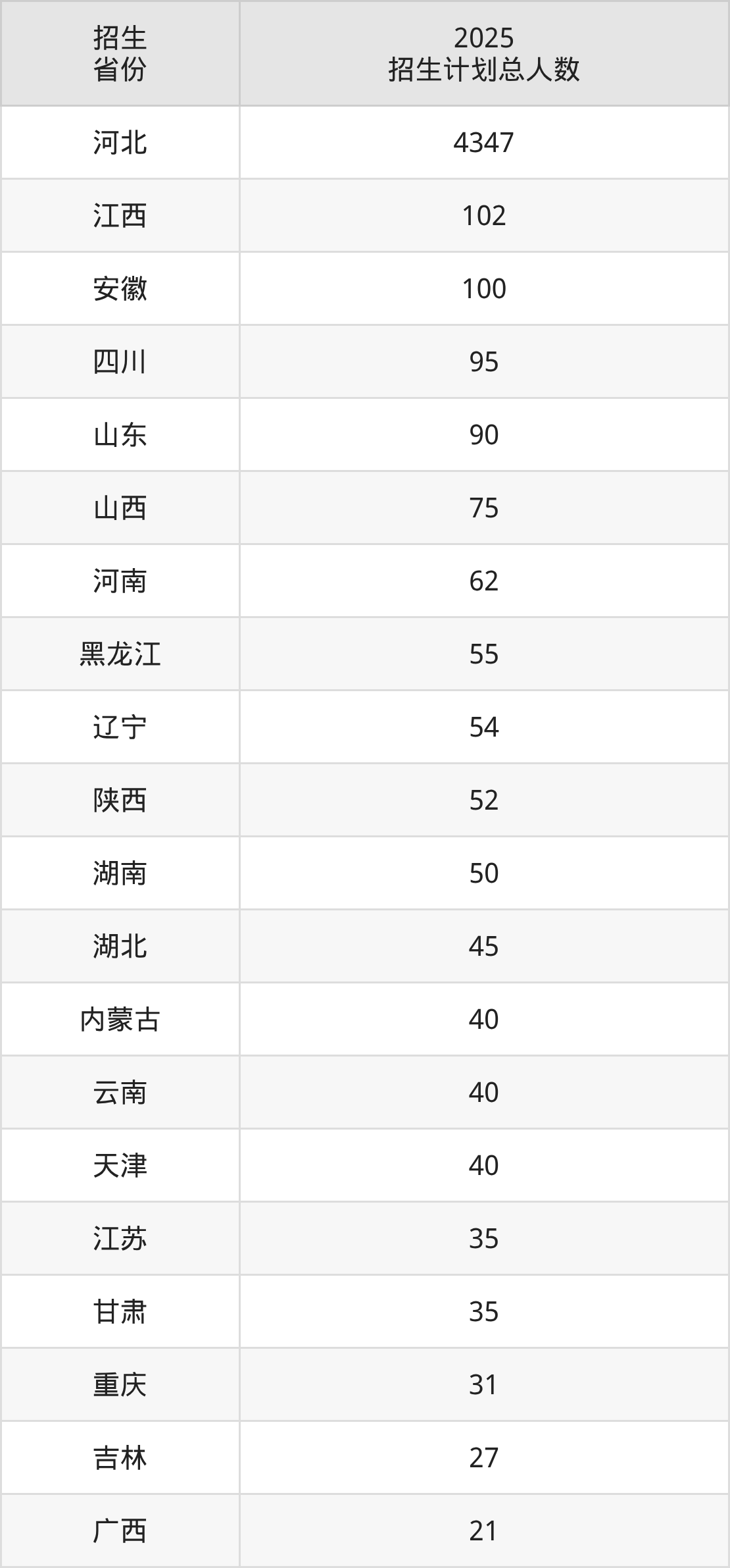 2025年河北师范大学面向全国27个省市开展本科招生;招生专业共50个,招生人数共5481人。2025年在河北省招生计划总人数是4347人,其中,河北师范大学在河北省招生人数最多的是数学与应用数学。河北师范大学在各省具体招生人数情况如下表。