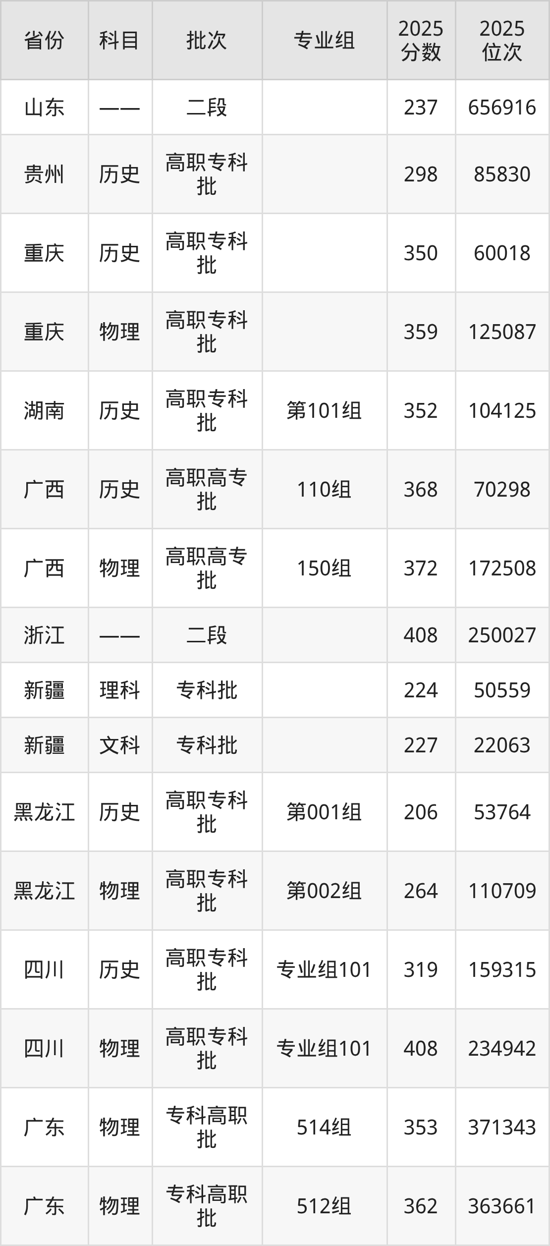 2025年在专科历史类进行招生,各专业组分数线详情如下: