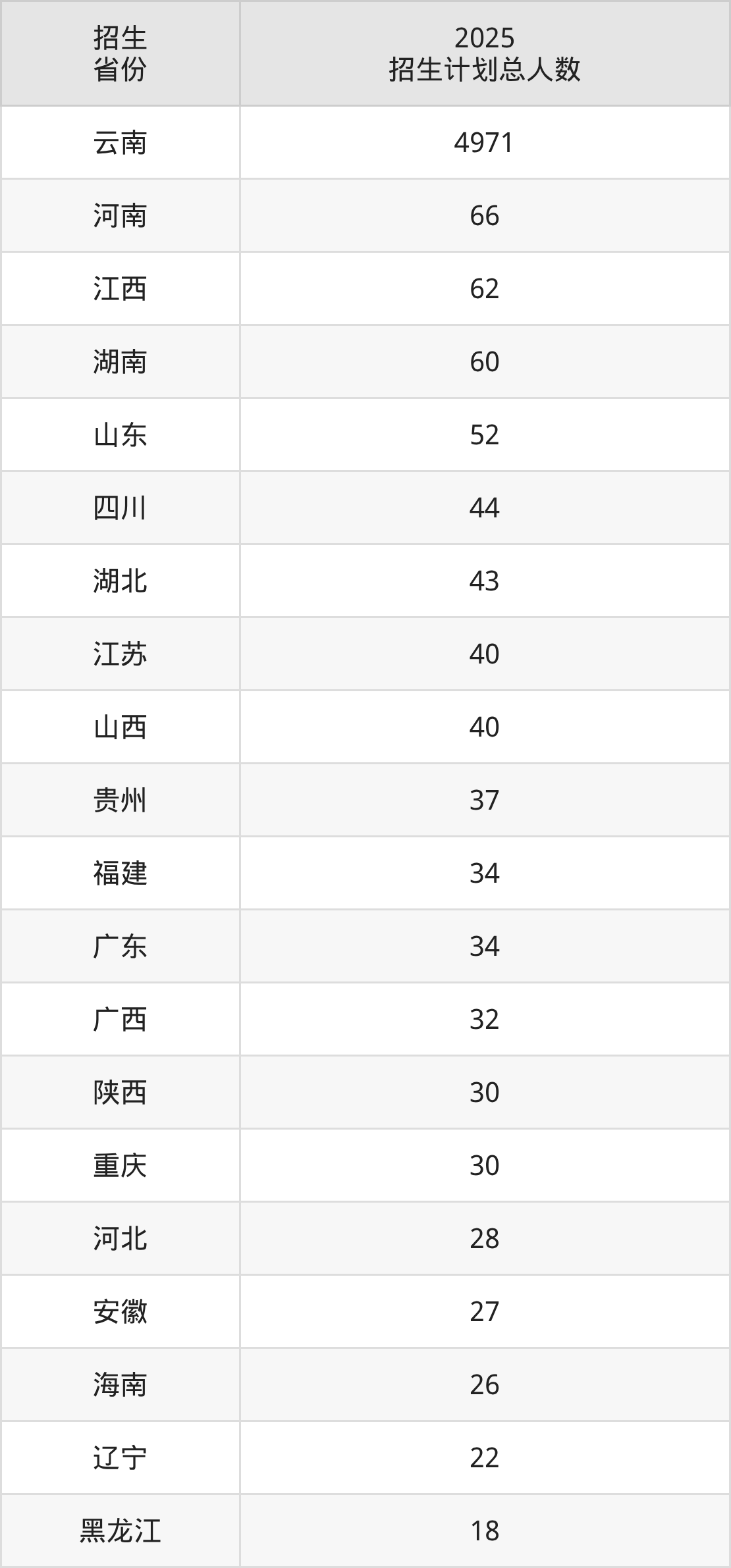 2025年云南师范大学面向全国27个省市开展本科招生;招生专业共61个,招生人数共5764人。2025年在云南省招生计划总人数是4971人,其中,云南师范大学在云南省招生人数最多的是数学与应用数学。云南师范大学在各省具体招生人数情况如下表。