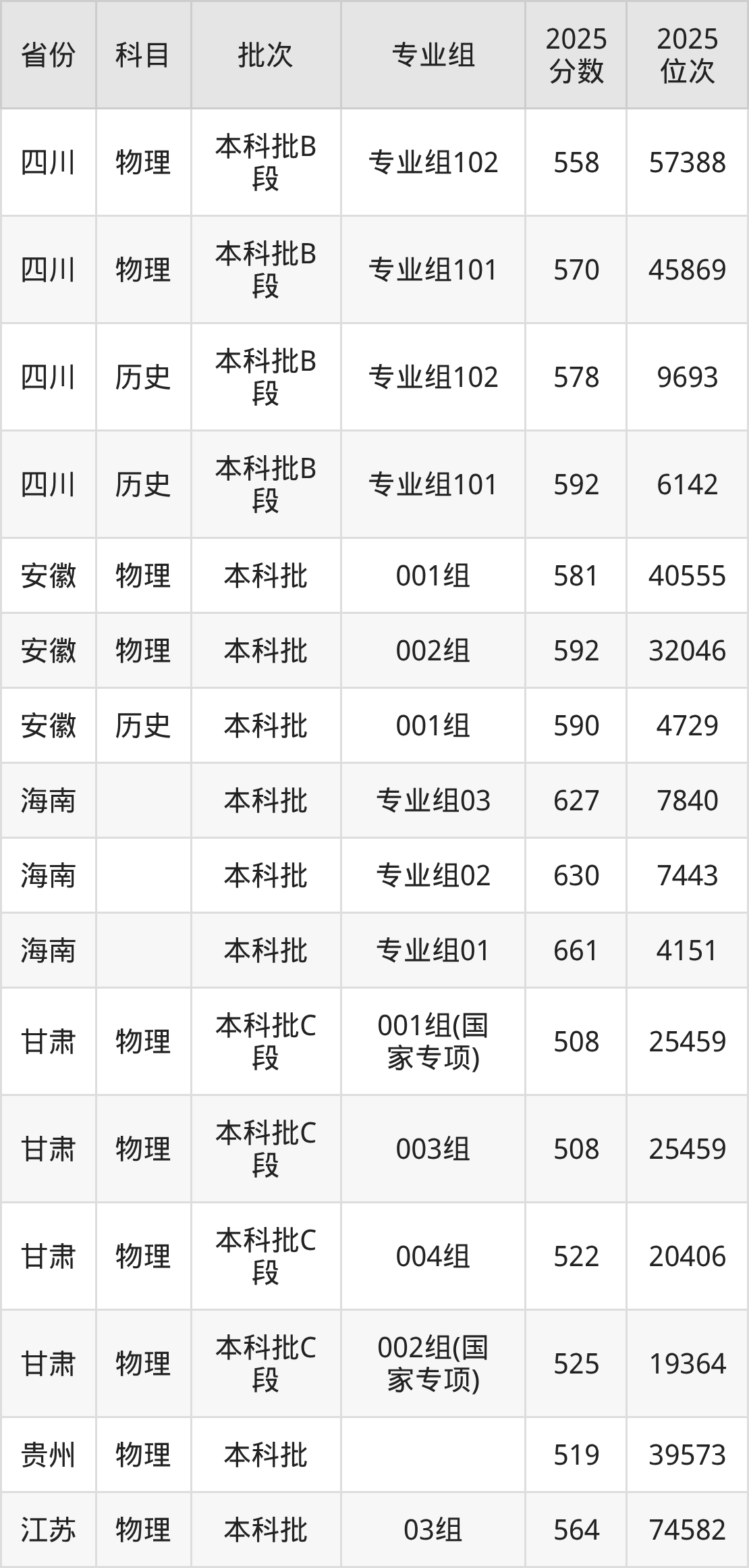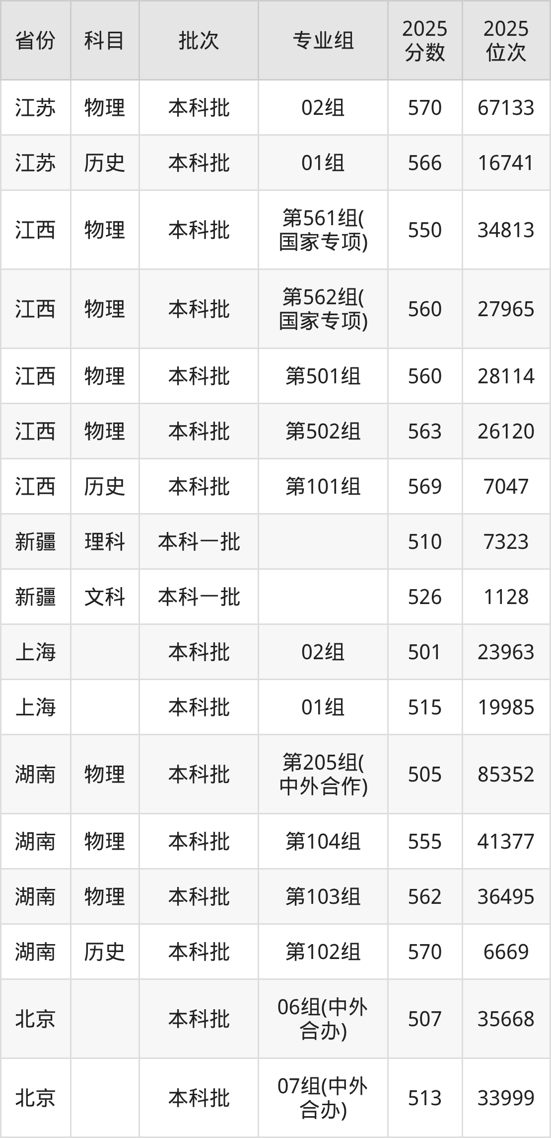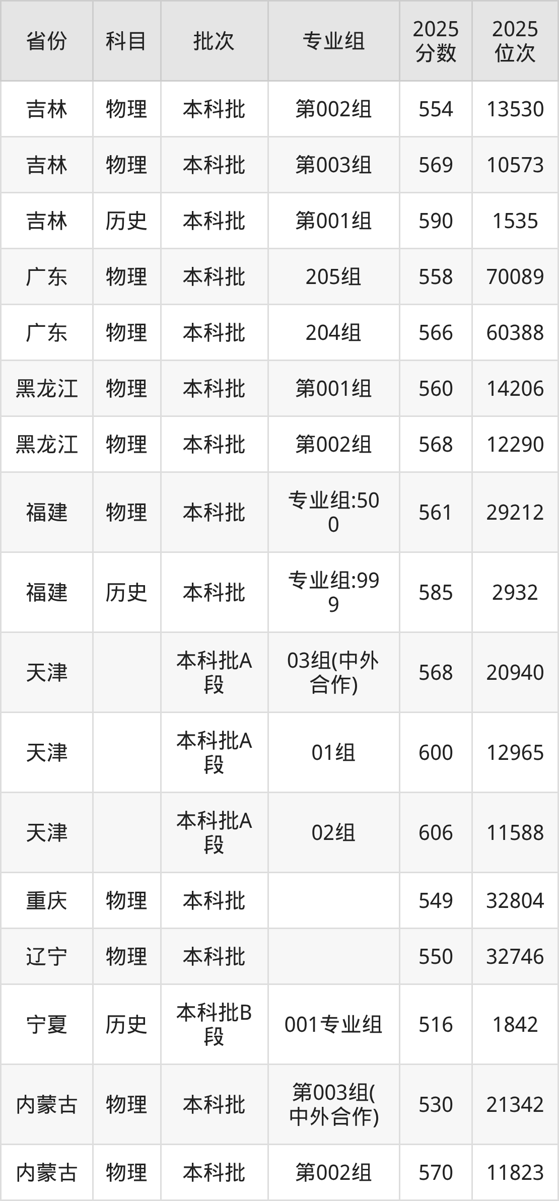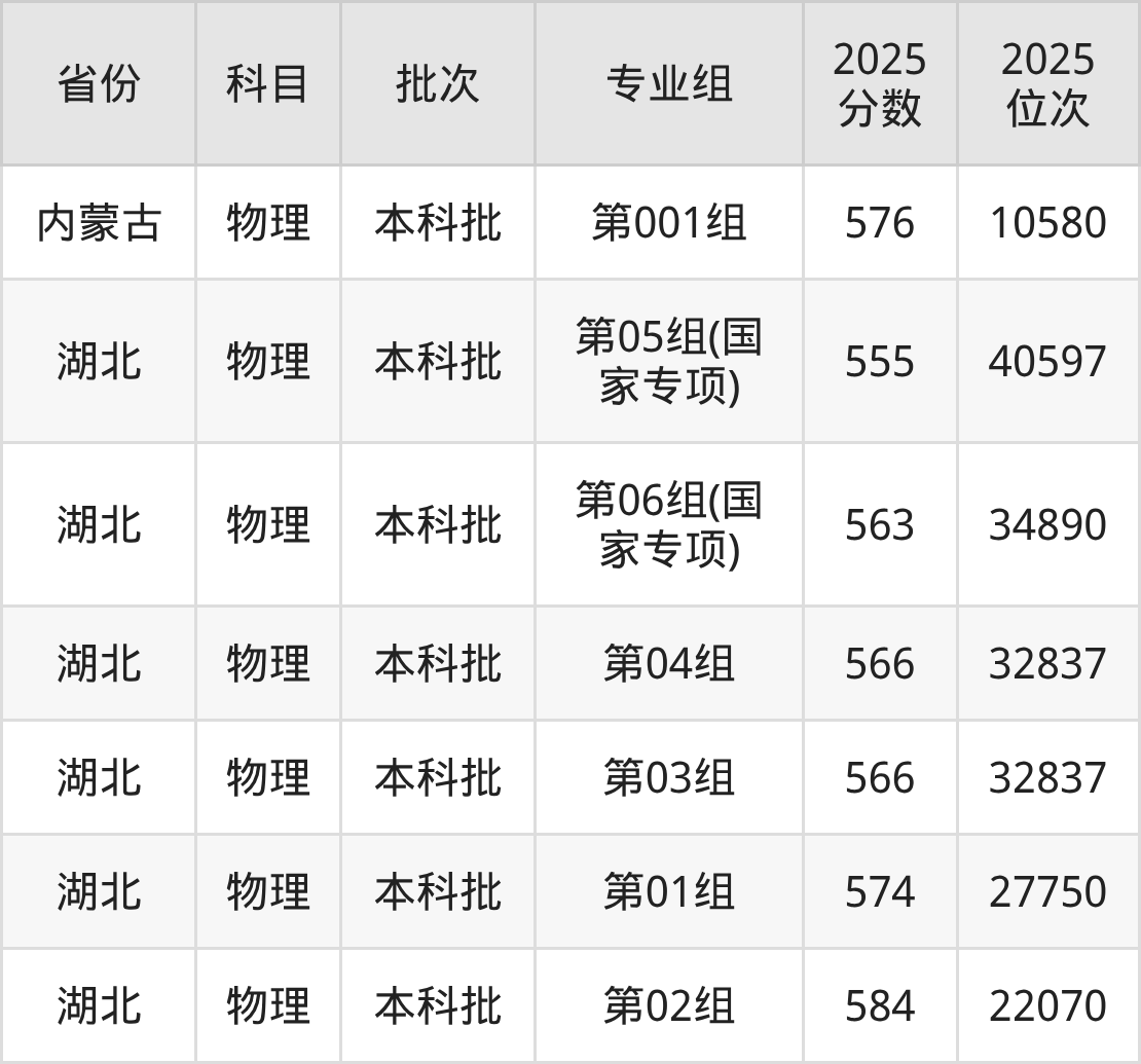 2025年在本科物理类进行招生,各专业组分数线详情如下: