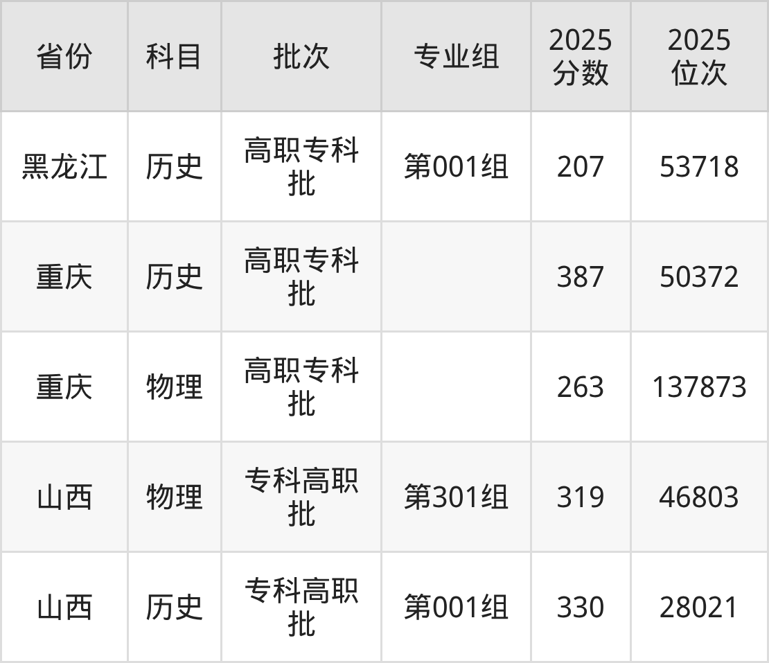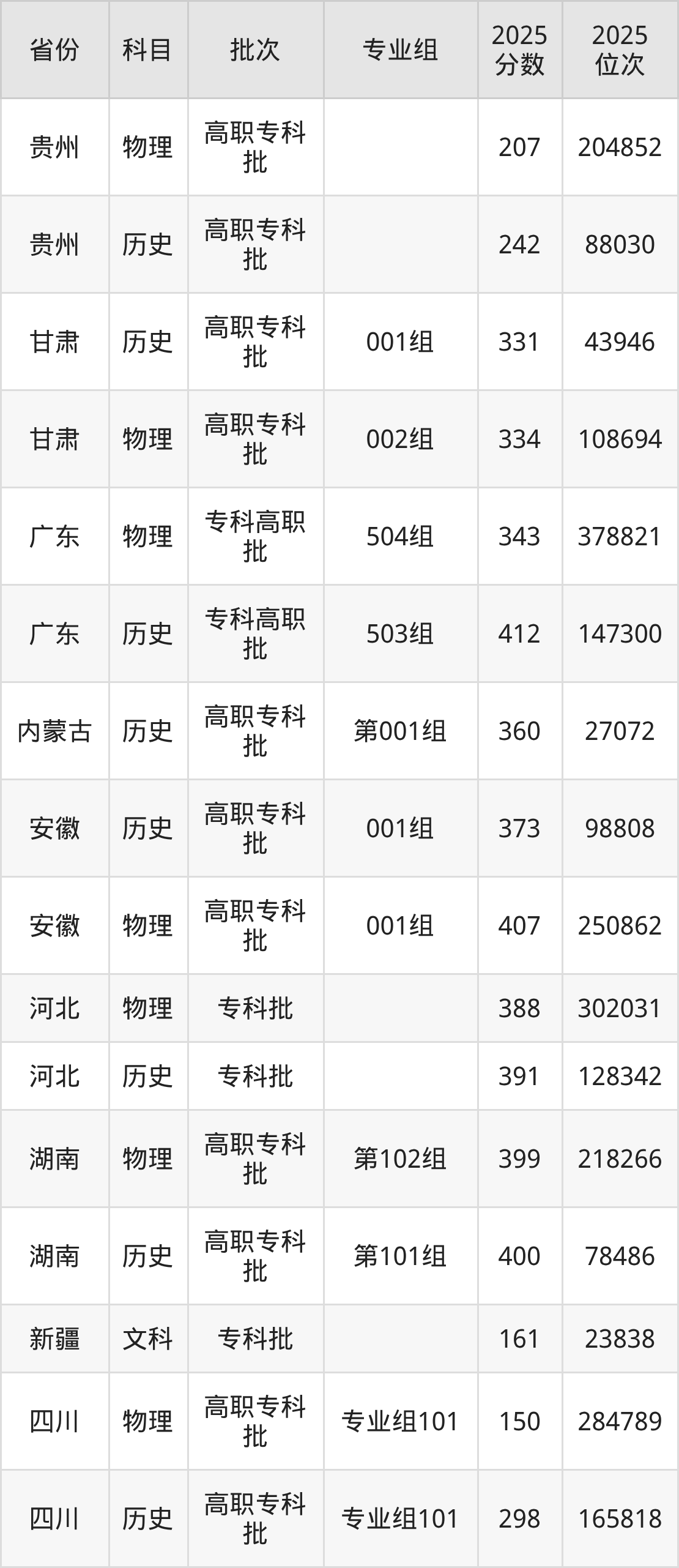 2025年在专科历史类进行招生,各专业组分数线详情如下: