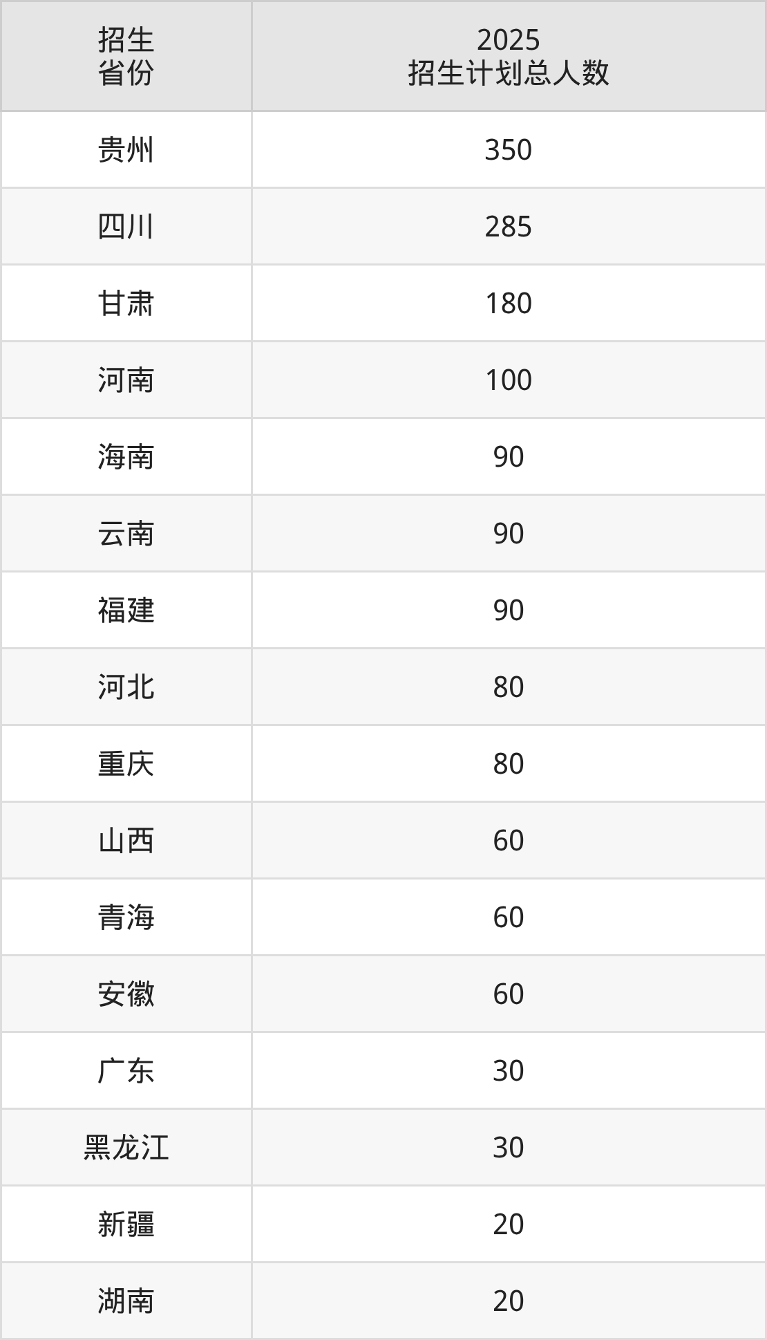 2025年鄂州职业大学面向全国17个省市开展专科招生;招生专业共43个,招生人数共1645人。鄂州职业大学在各省具体招生人数情况如下表。