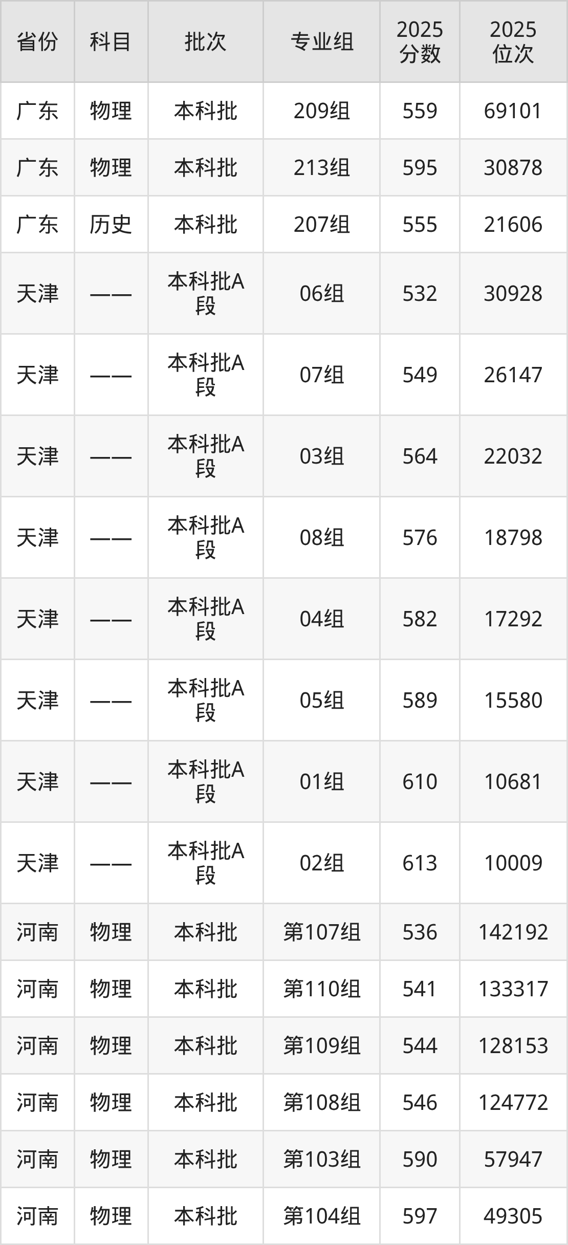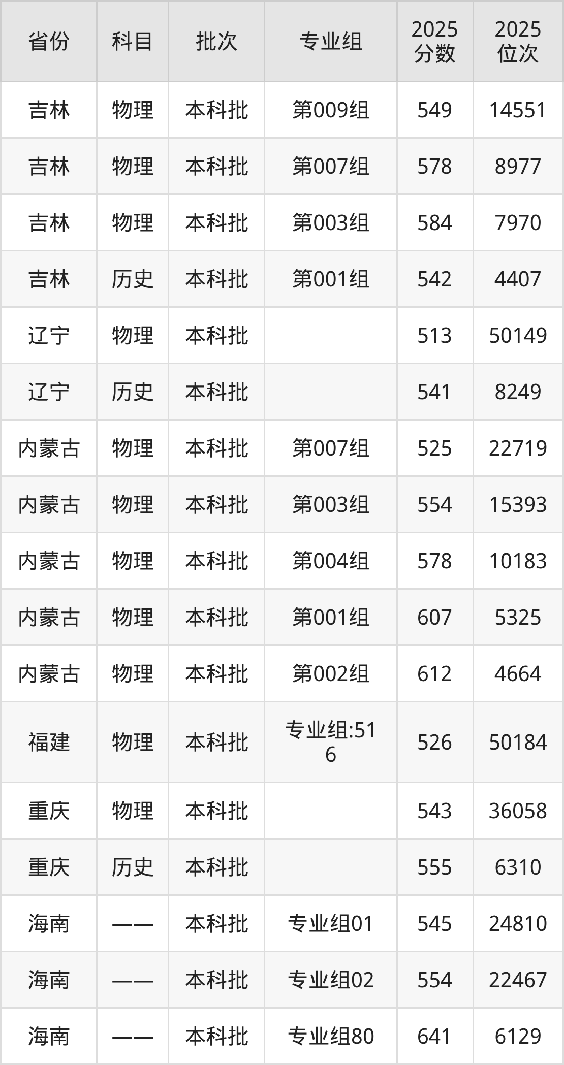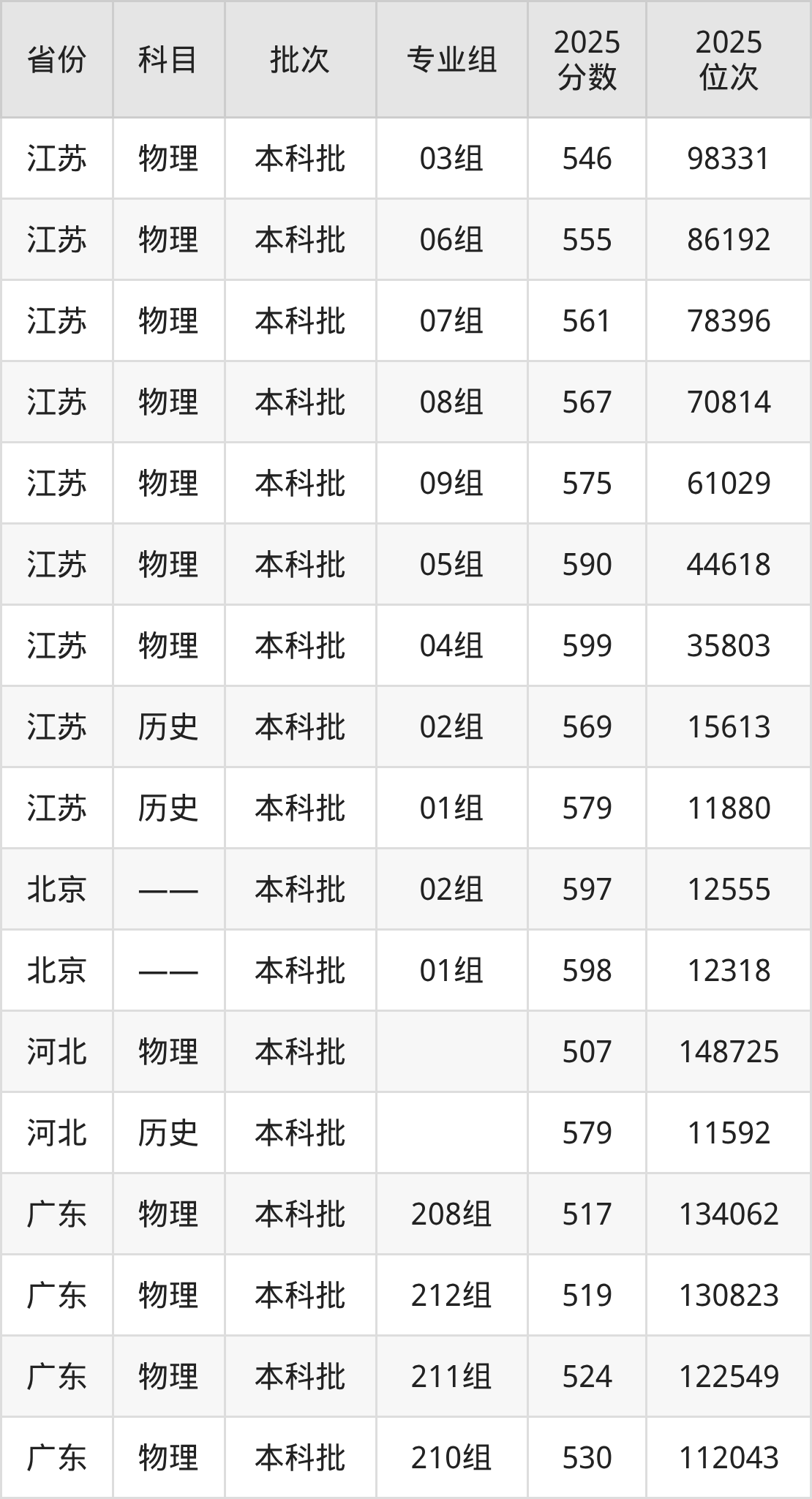 2025年在本科物理类进行招生,各专业组分数线详情如下: