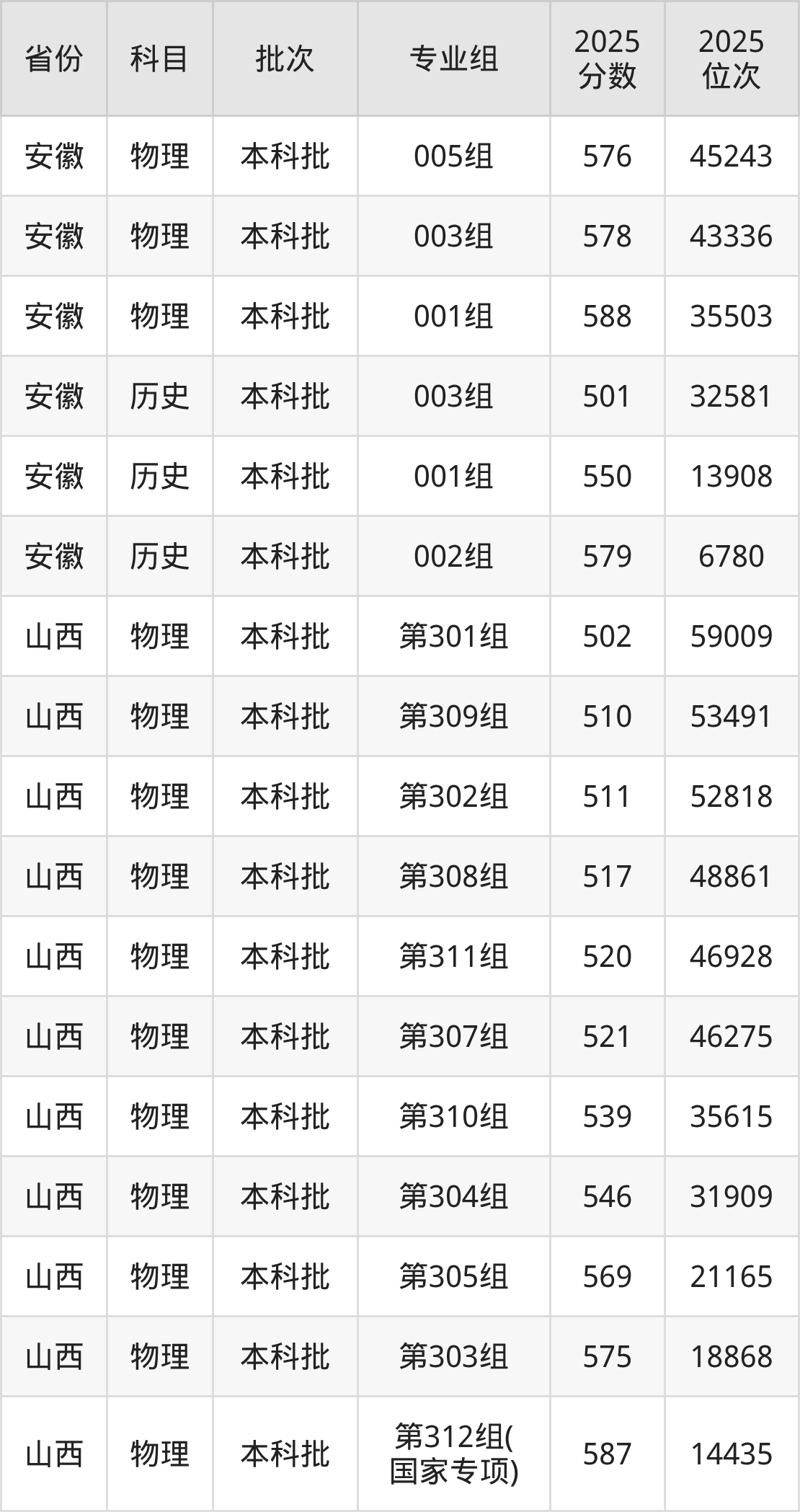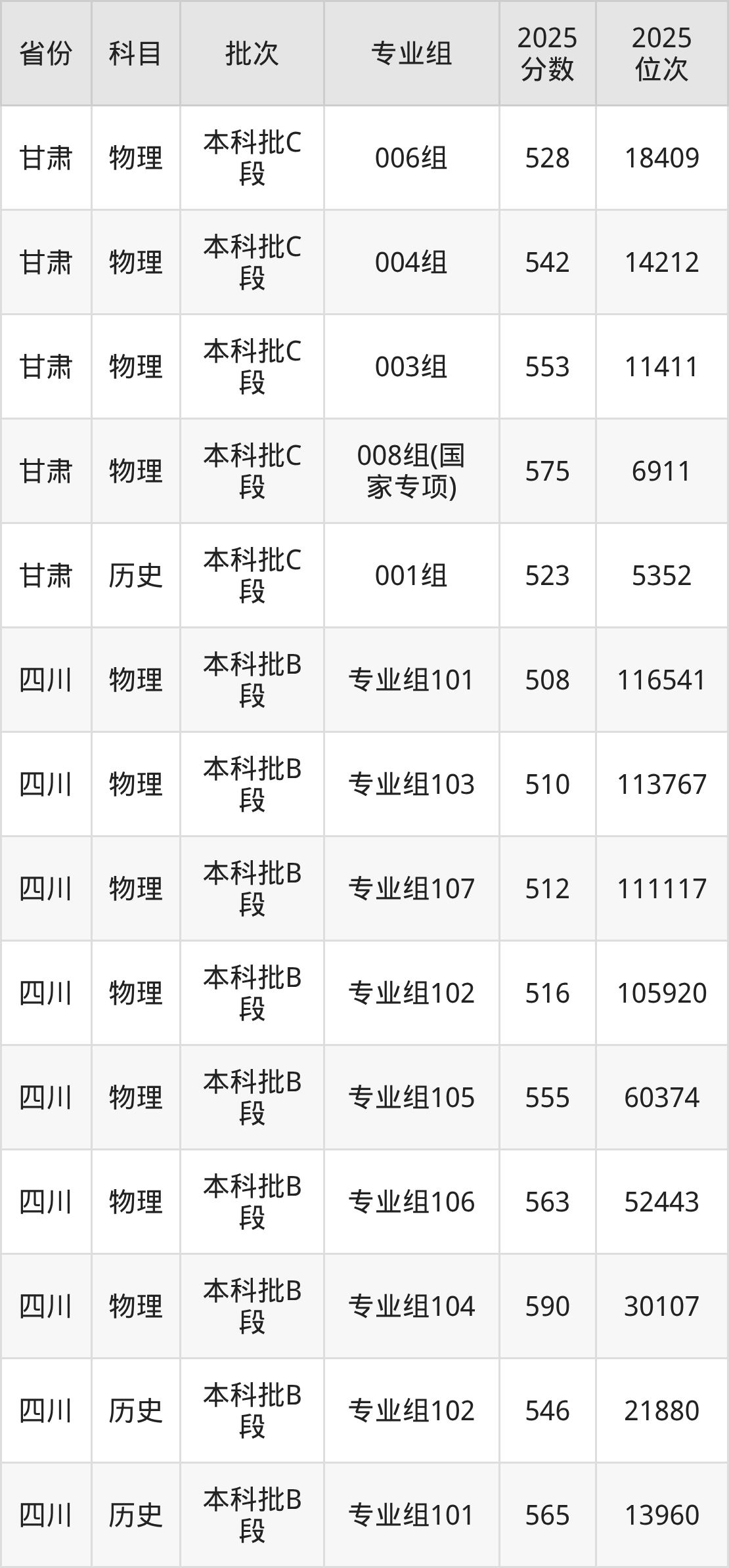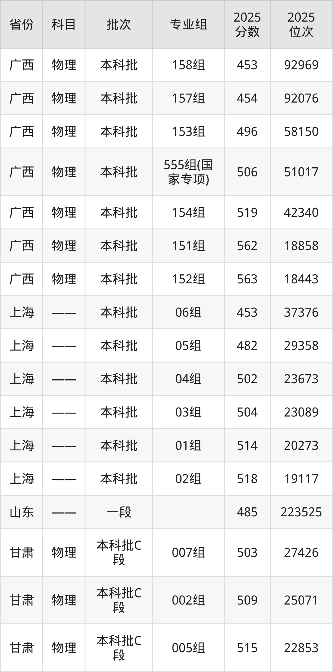 2025年在本科物理类进行招生,各专业组分数线详情如下: