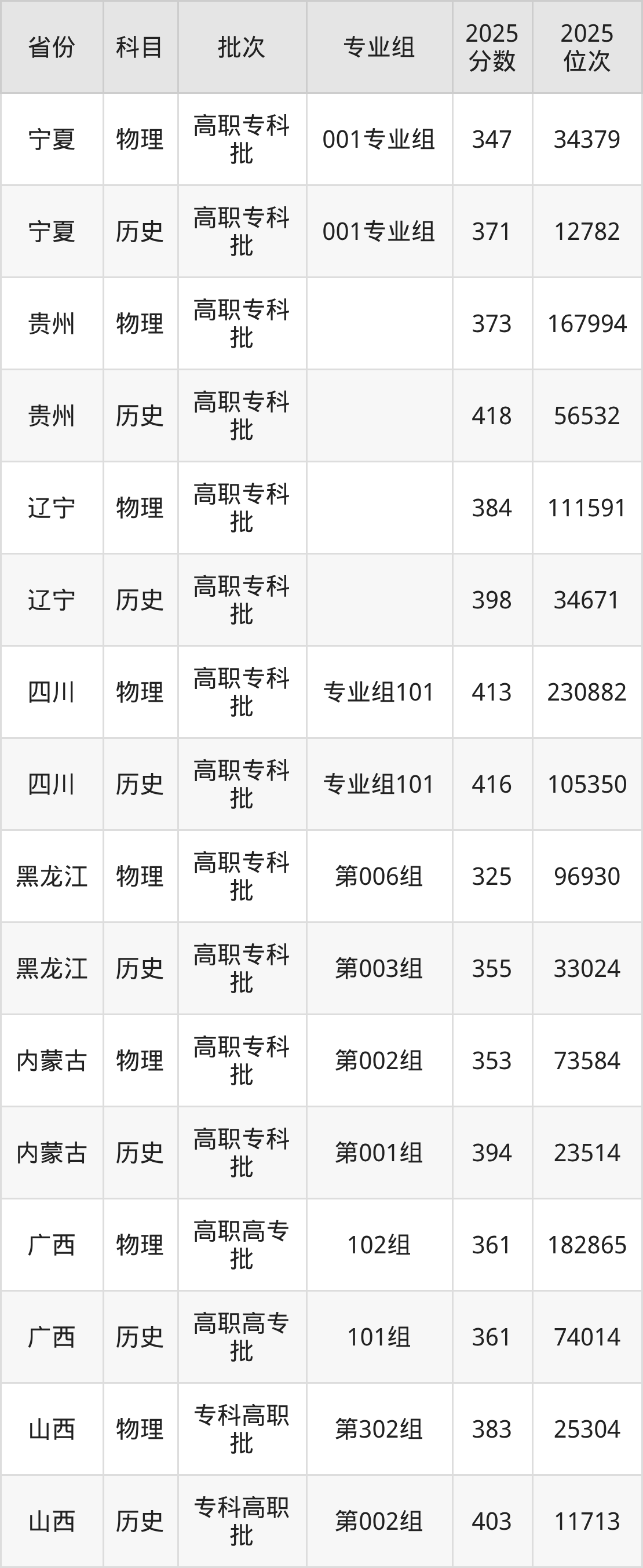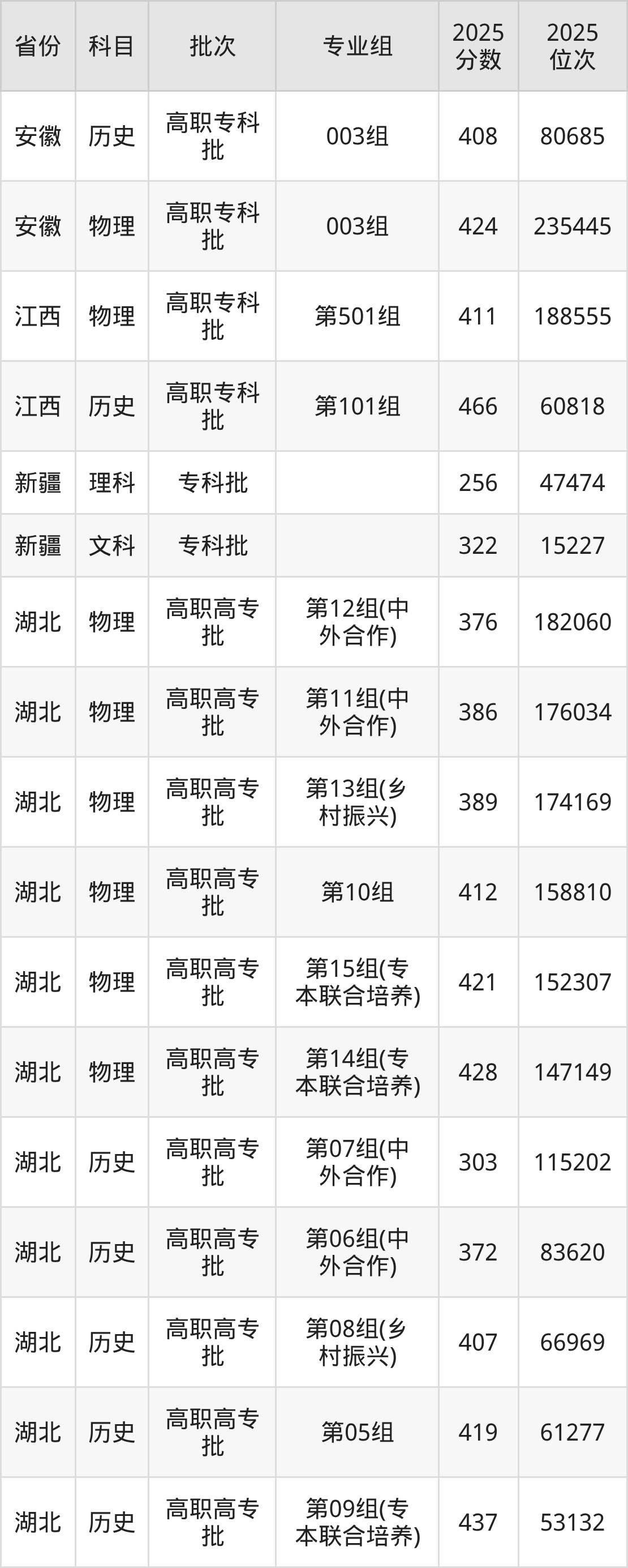2025年湖北交通职业技术学院全国录取分数线是256分到466分,录取最低在新疆理科、录取最高在江西历史类(第101组)。各省各专业组最低分具有差异,详情如下: