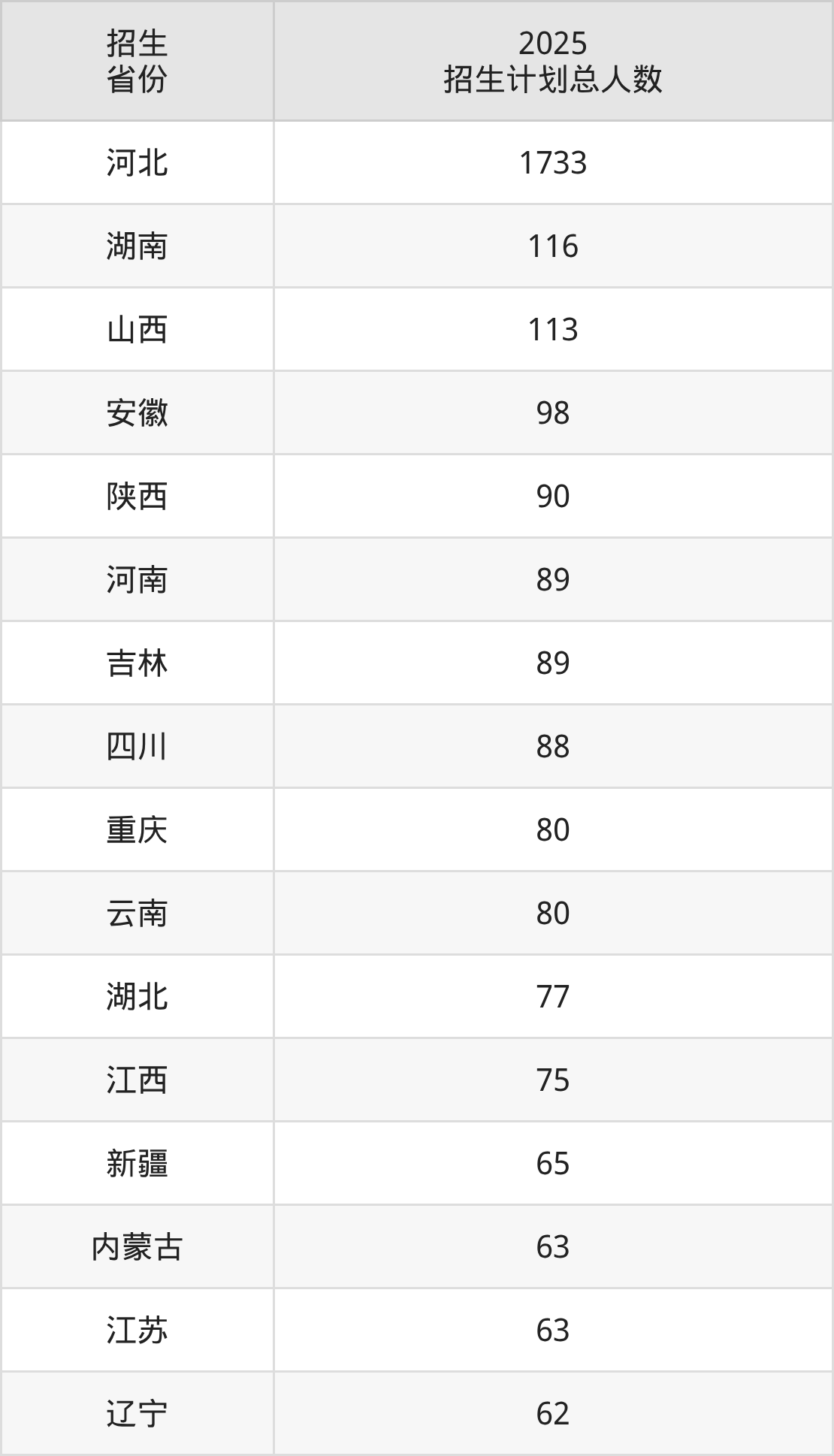 2025年河北地质大学面向全国28个省市开展本科招生;招生专业共33个,招生人数共3364人。2025年在河北省招生计划总人数是1733人,其中,河北地质大学在河北省招生人数最多的是计算机科学与技术。河北地质大学在各省具体招生人数情况如下表。