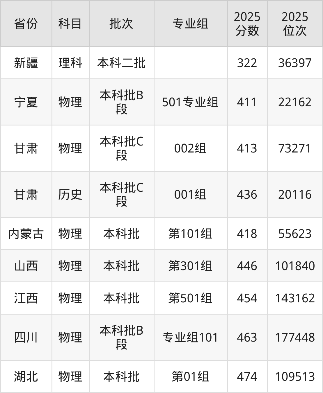 2025年在本科物理类进行招生,各专业组分数线详情如下: