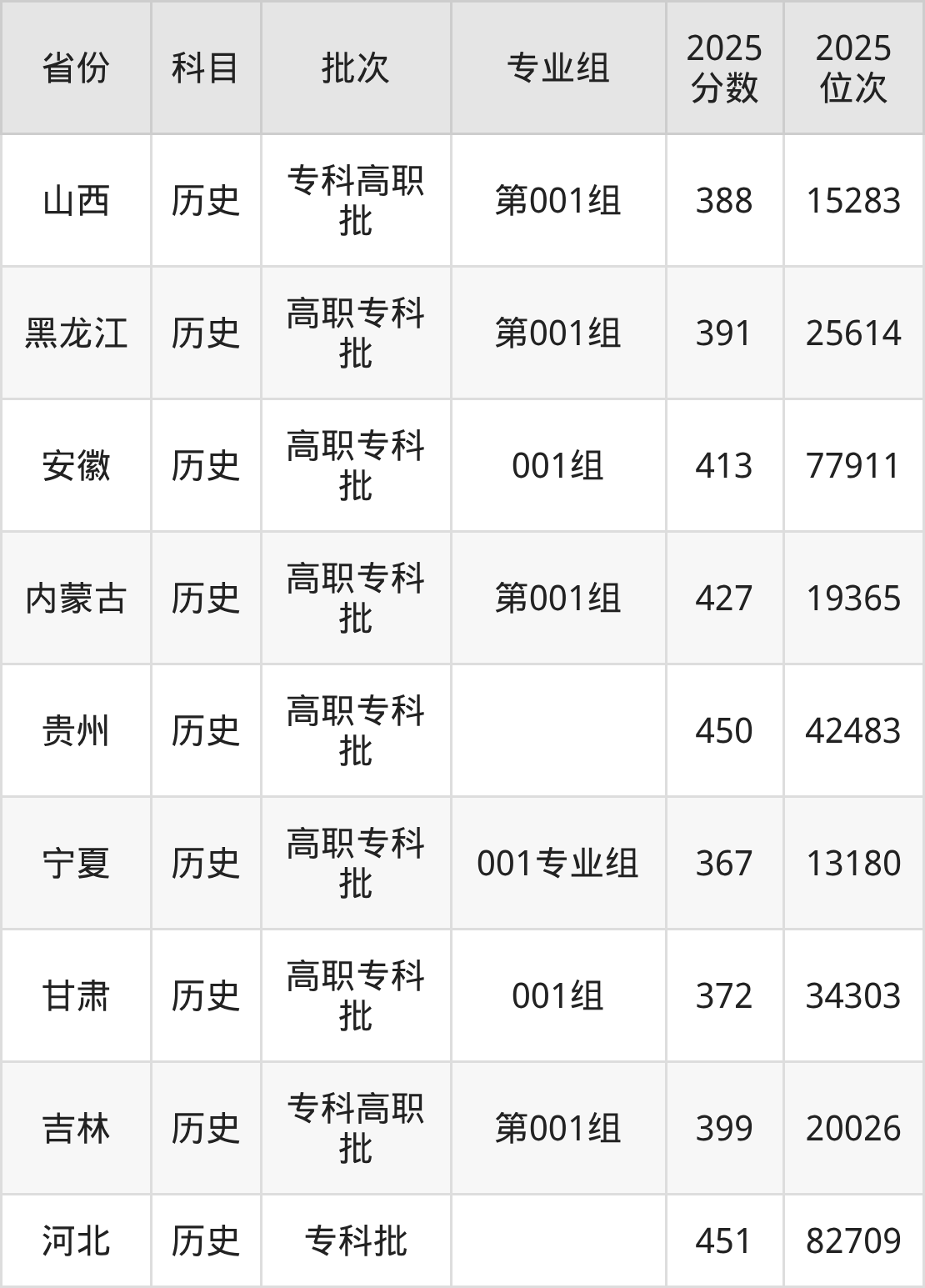 2025年在专科历史类进行招生,各专业组分数线详情如下: