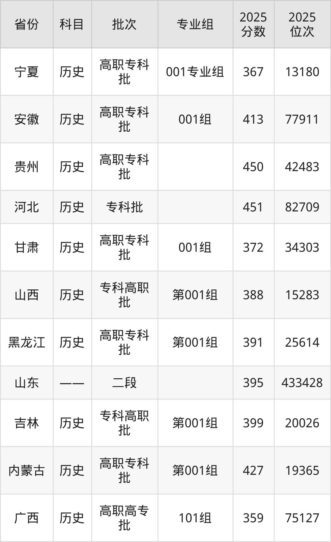 专科历史类投档录取最低451分