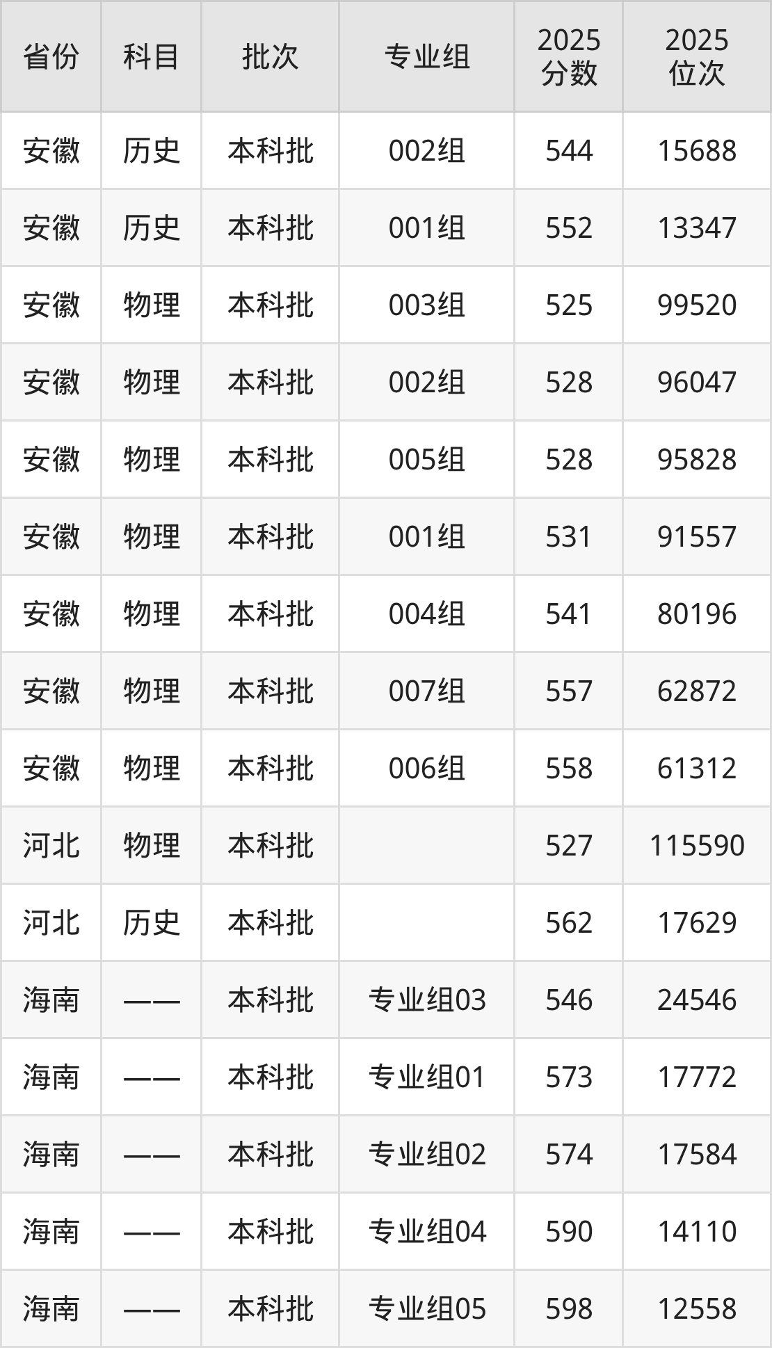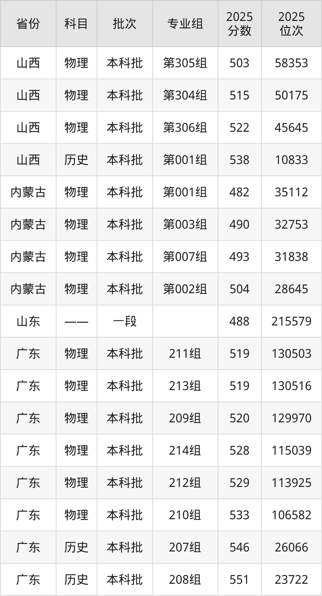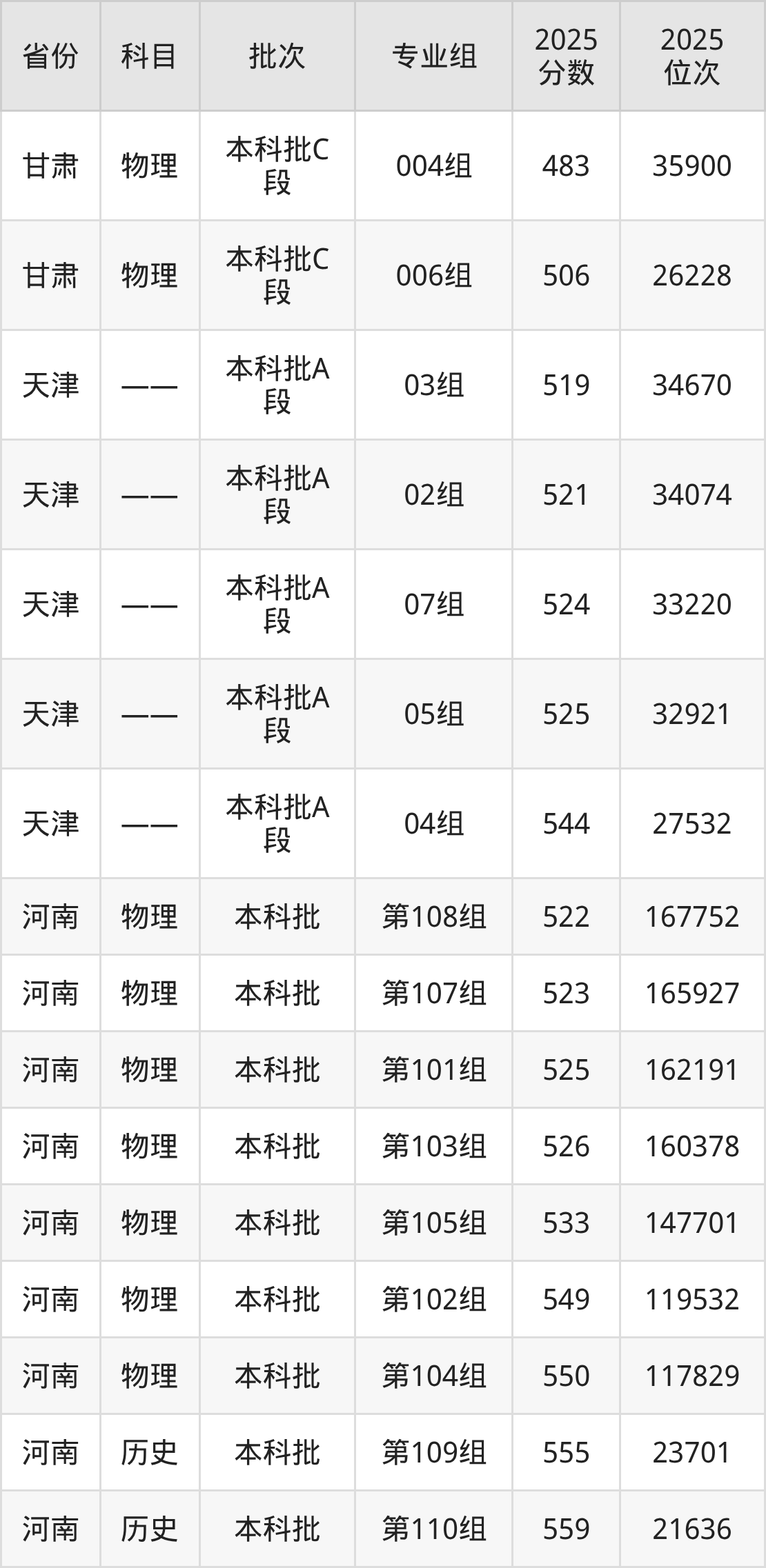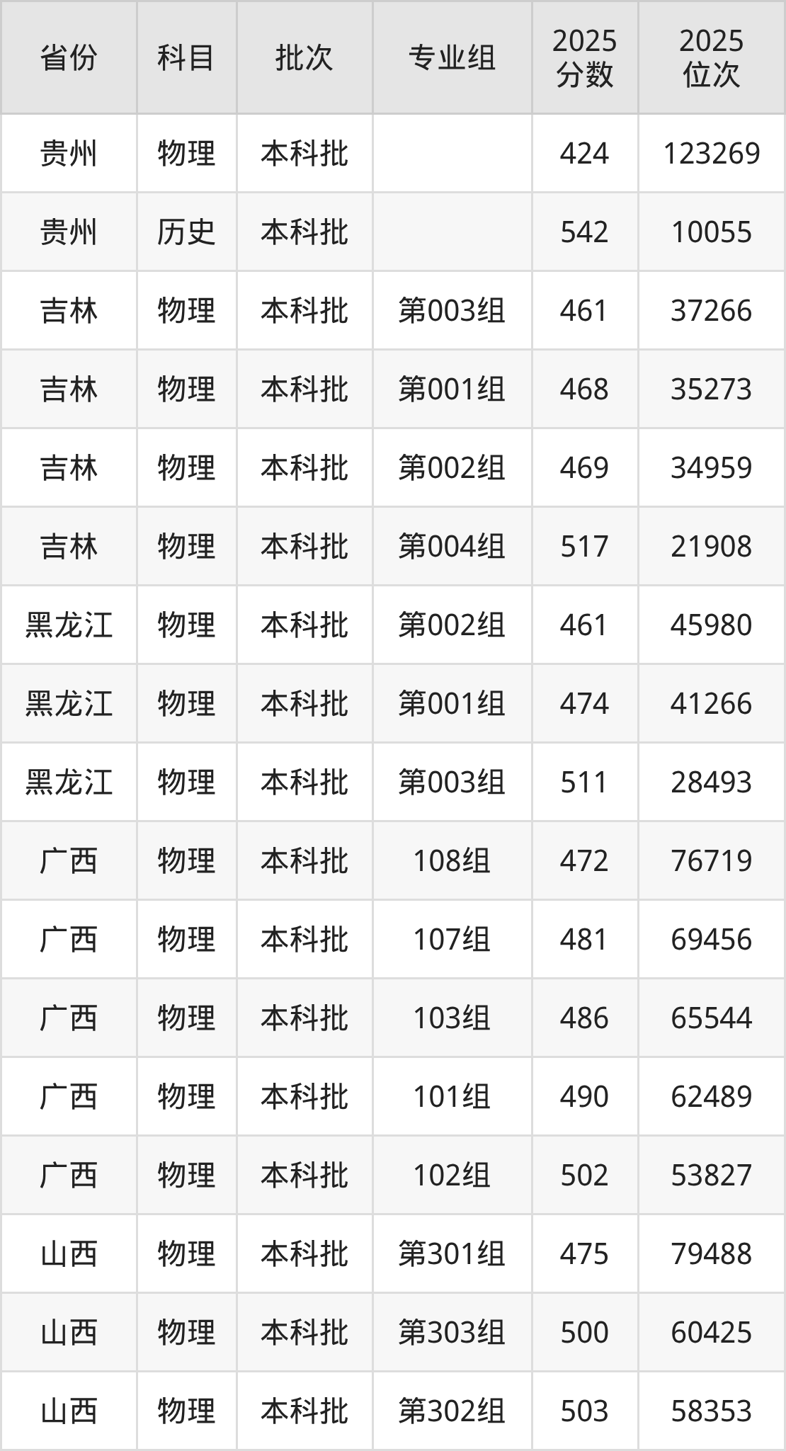 2025年在本科物理类进行招生,各专业组分数线详情如下: