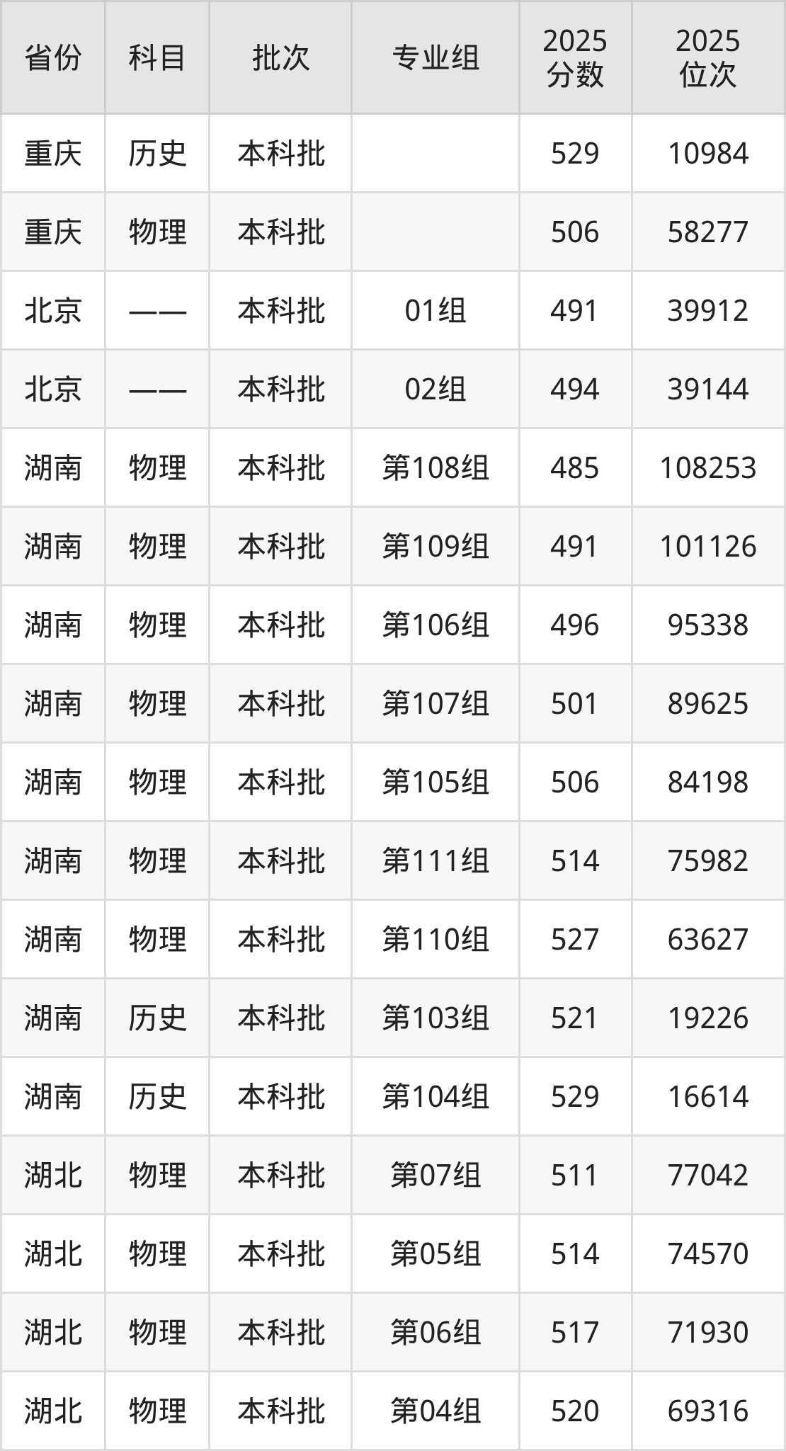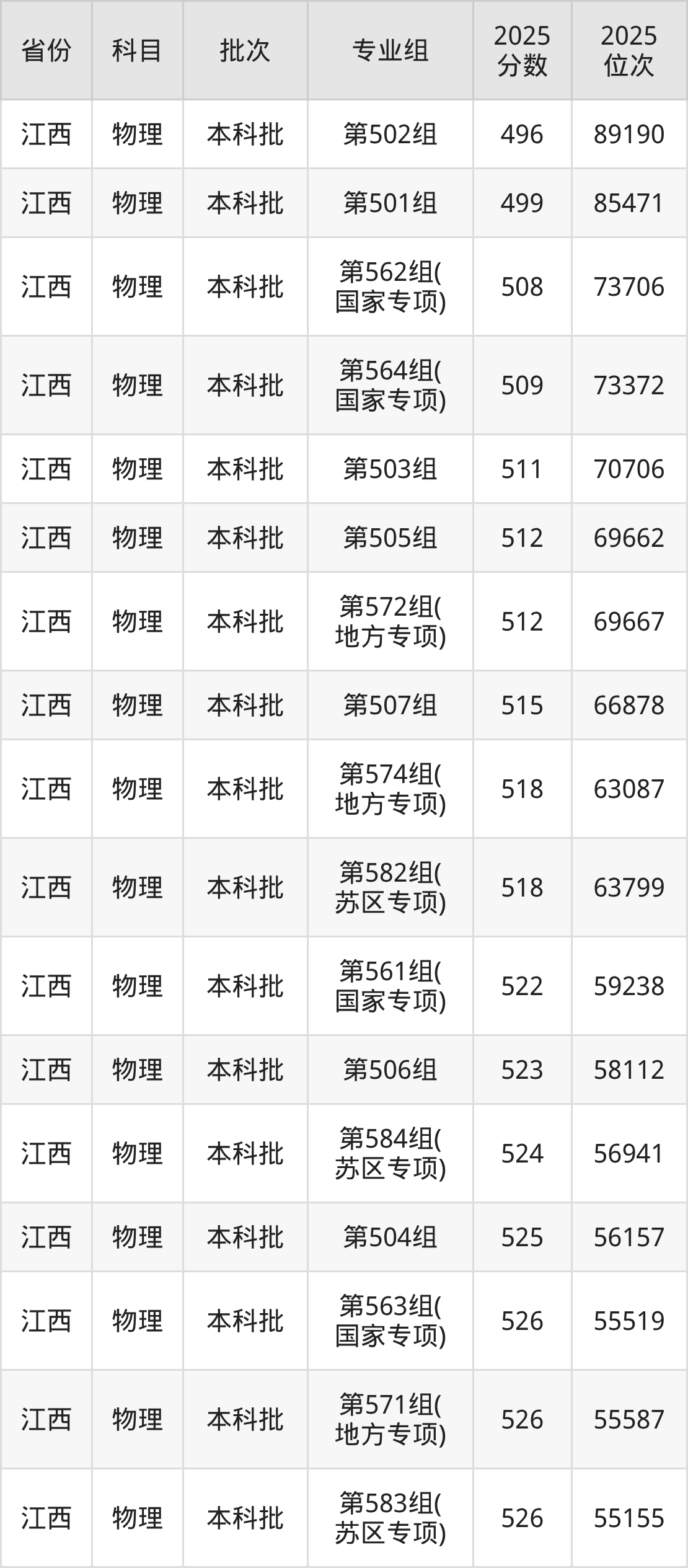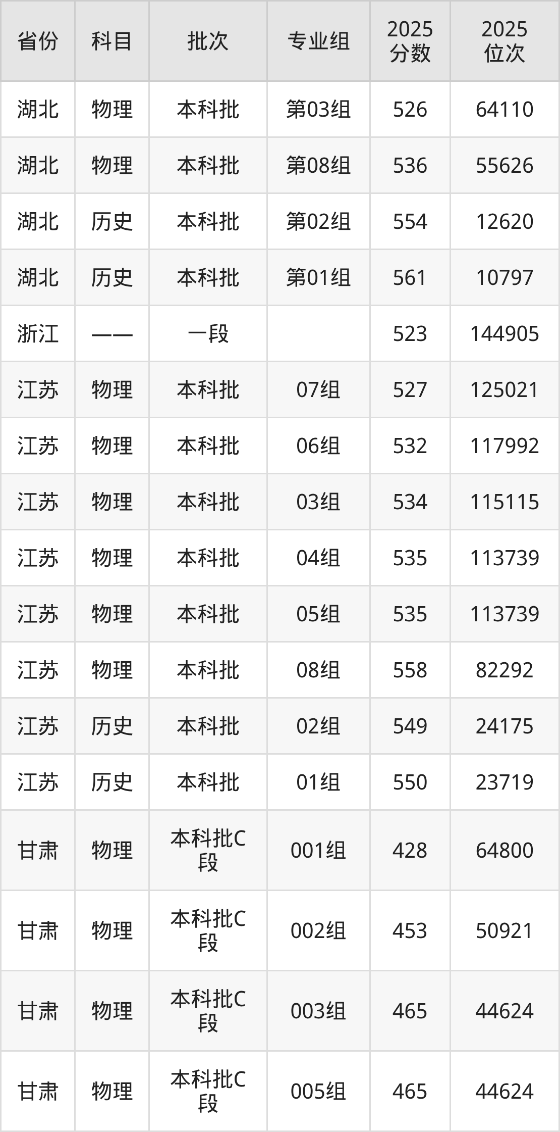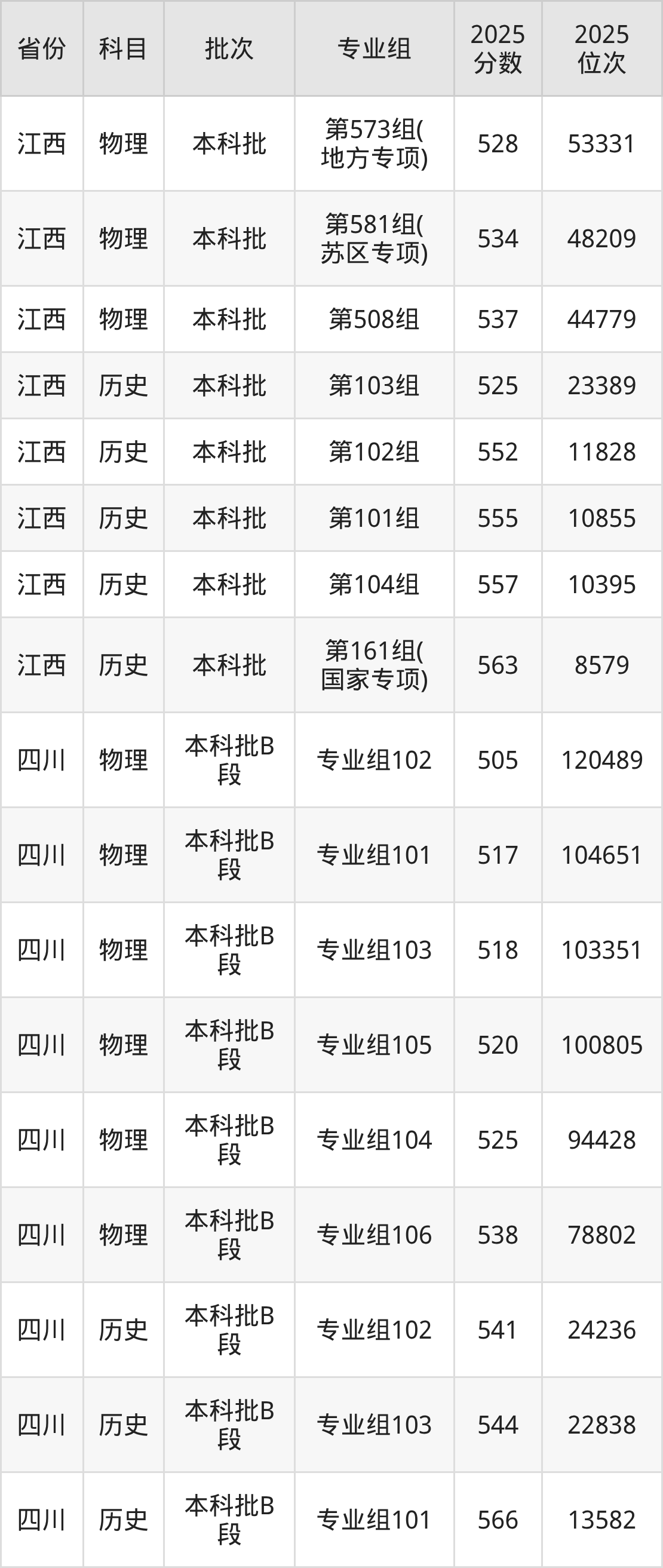 2025年在本科物理类进行招生,各专业组分数线详情如下: