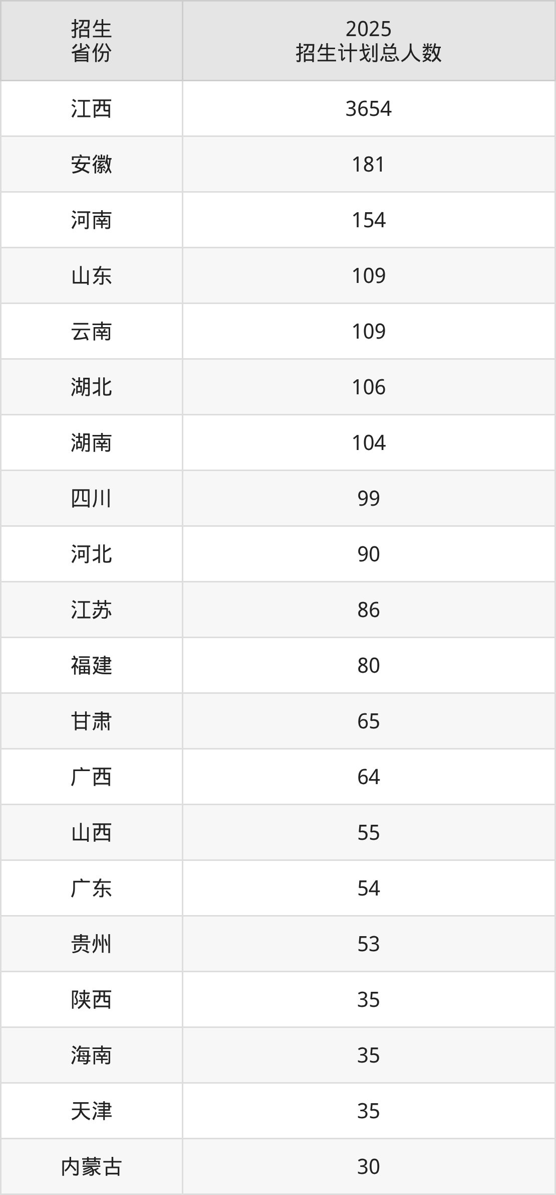 2025年江西农业大学面向全国29个省市开展本科招生;招生专业共51个,招生人数共5342人。2025年在江西省招生计划总人数是3654人,其中,江西农业大学在江西省招生人数最多的是软件工程。江西农业大学在各省具体招生人数情况如下表。