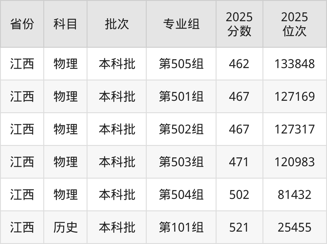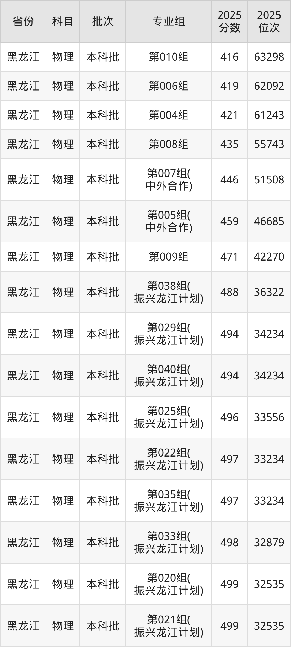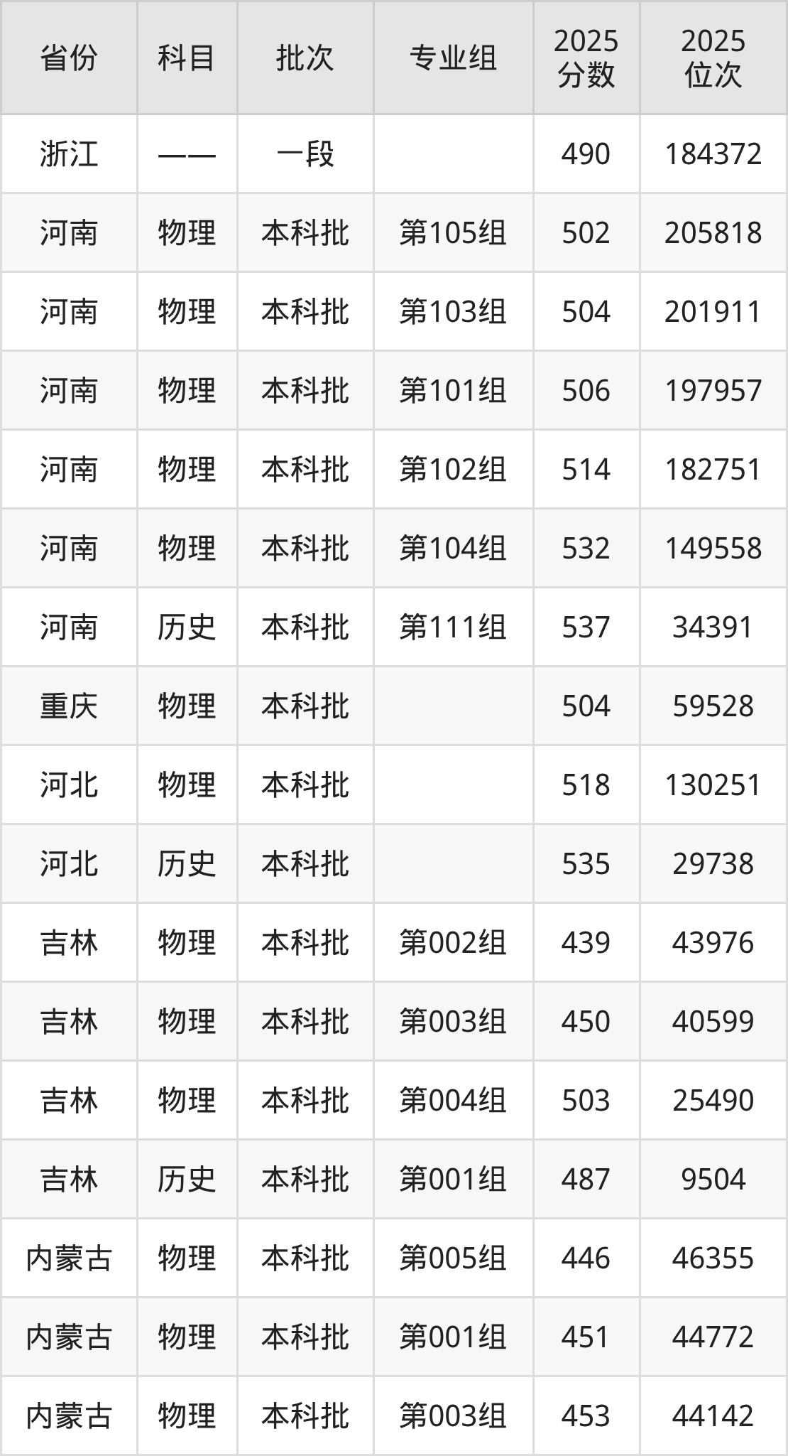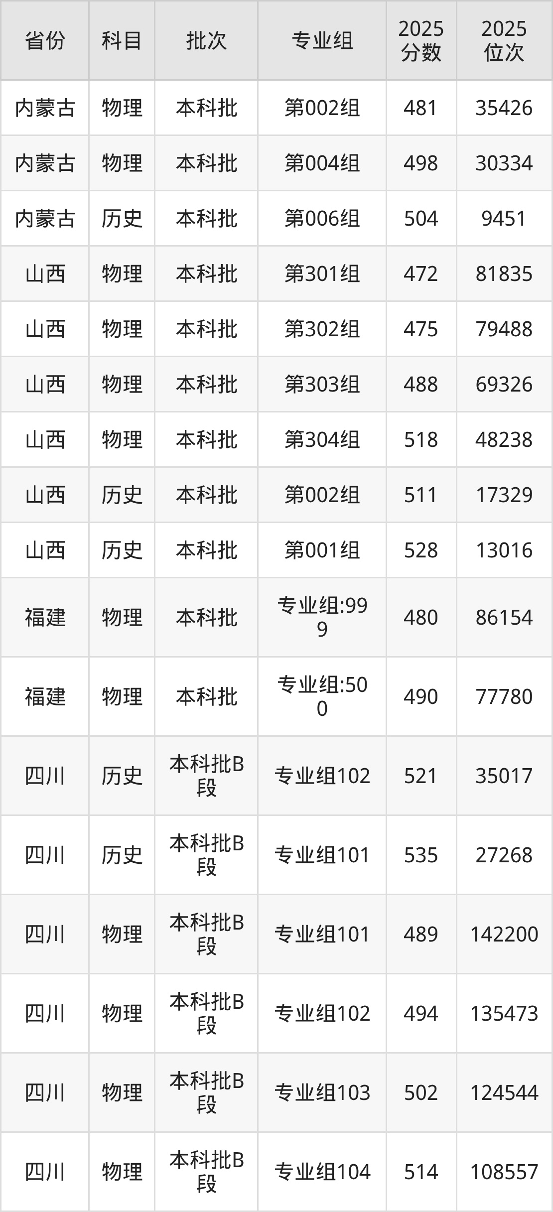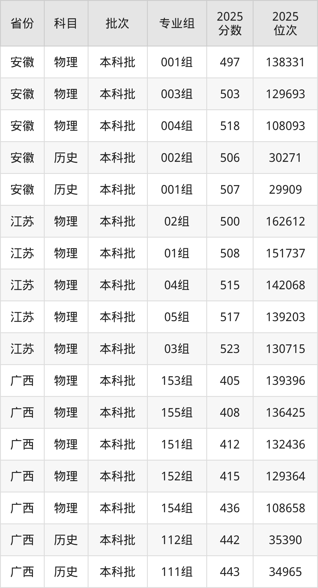 2025年在本科物理类进行招生,各专业组分数线详情如下: