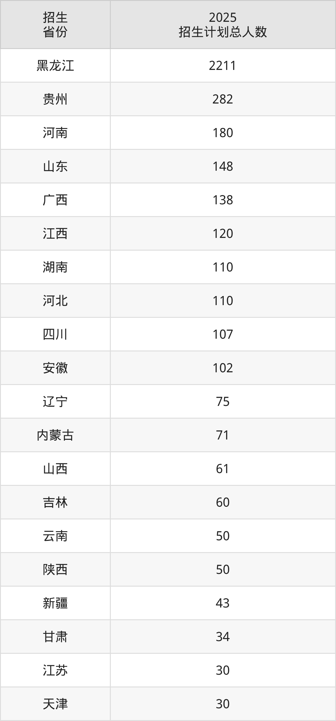 2025年黑龙江八一农垦大学面向全国23个省市开展本科招生;招生专业共48个,招生人数共4067人。2025年在黑龙江省招生计划总人数是2211人,其中,黑龙江八一农垦大学在黑龙江省招生人数最多的是计算机科学与技术。黑龙江八一农垦大学在各省具体招生人数情况如下表。