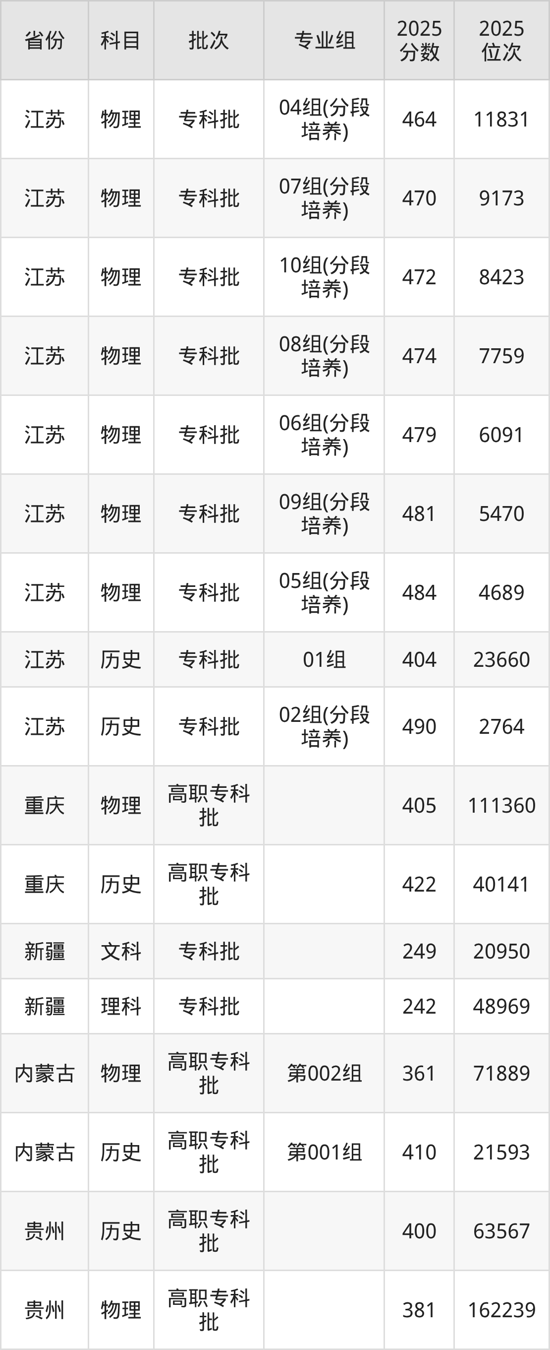 徐州工业职业技术学院09组(分段培养项目):2025年投档录取最低分为481分,录取最低位次为5470名。
