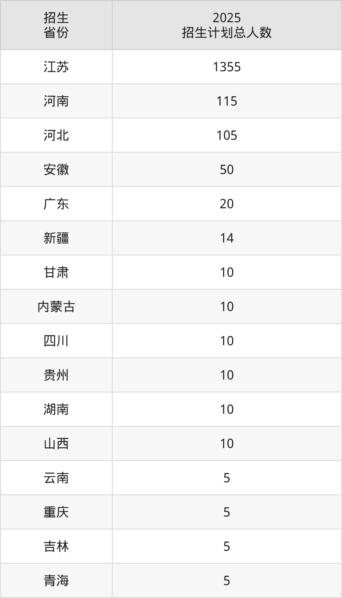 2025年徐州工业职业技术学院面向全国18个省市开展专科招生;招生专业共27个,招生人数共1749人。2025年在江苏省招生计划总人数是1355人,其中,徐州工业职业技术学院在江苏省招生人数最多的是高分子材料智能制造技术。徐州工业职业技术学院在各省具体招生人数情况如下表。