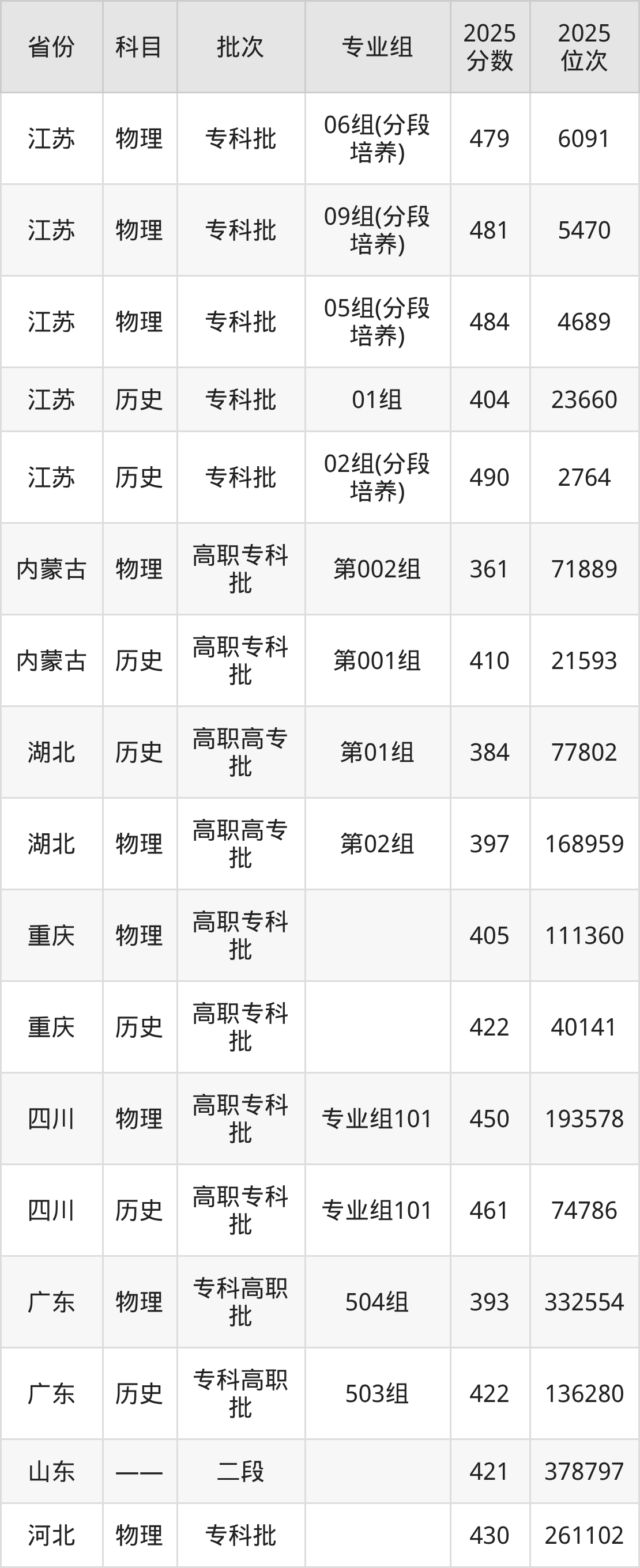 徐州工业职业技术学院06组(分段培养项目):2025年投档录取最低分为479分,录取最低位次为6091名。