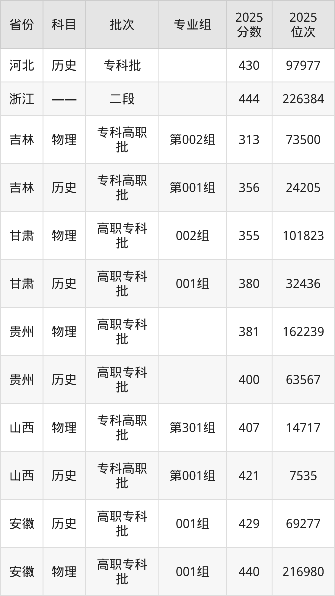 普通类专科物理类最低361分,专科历史类最低410分