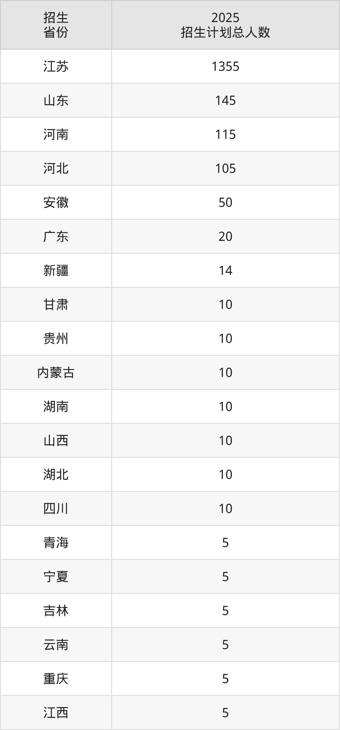 2025年徐州工业职业技术学院面向全国21个省市开展专科招生;招生专业共27个,招生人数共1909人。2025年在江苏省招生计划总人数是1355人,其中,徐州工业职业技术学院在江苏省招生人数最多的是高分子材料智能制造技术。徐州工业职业技术学院在各省具体招生人数情况如下表。