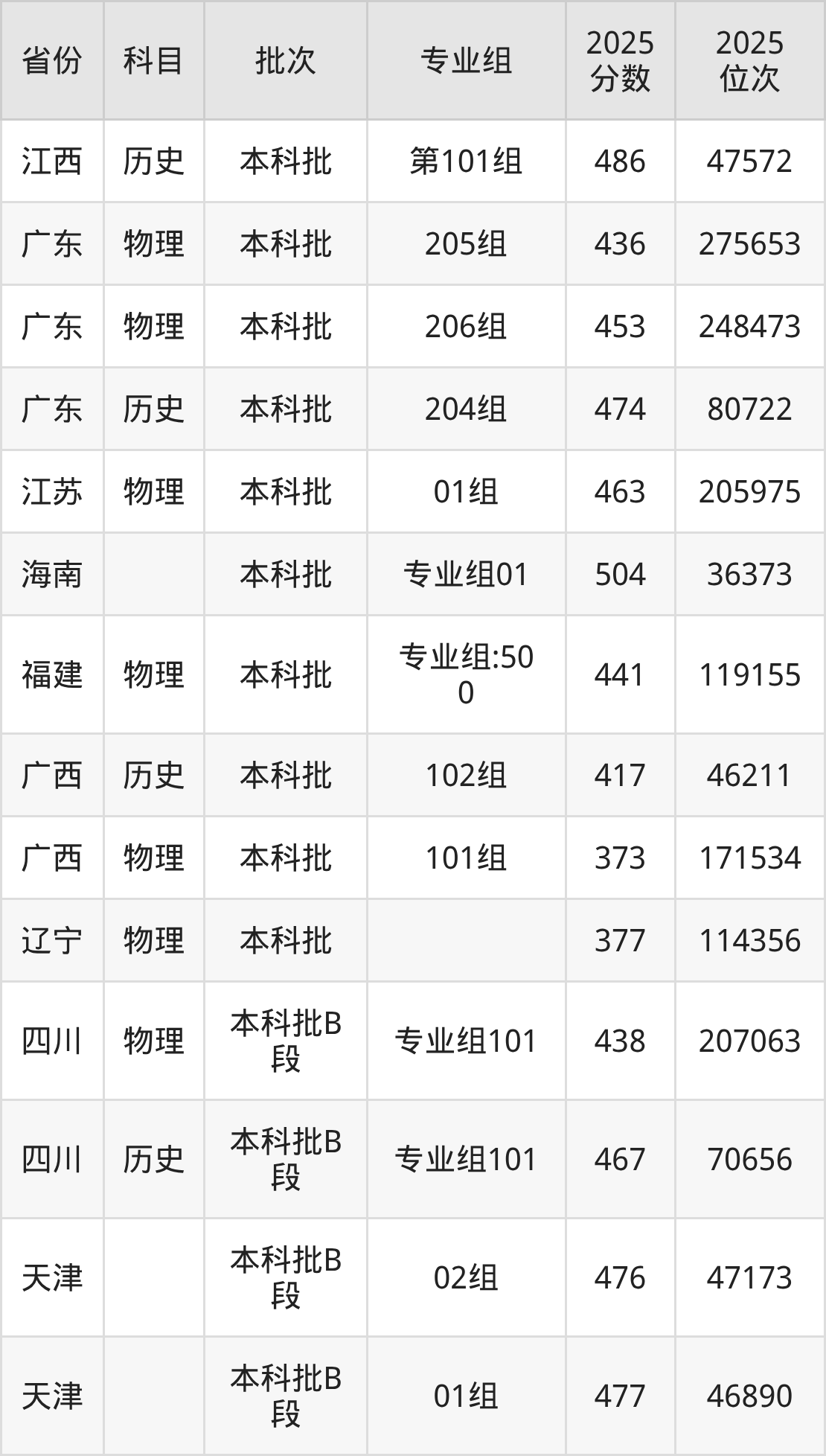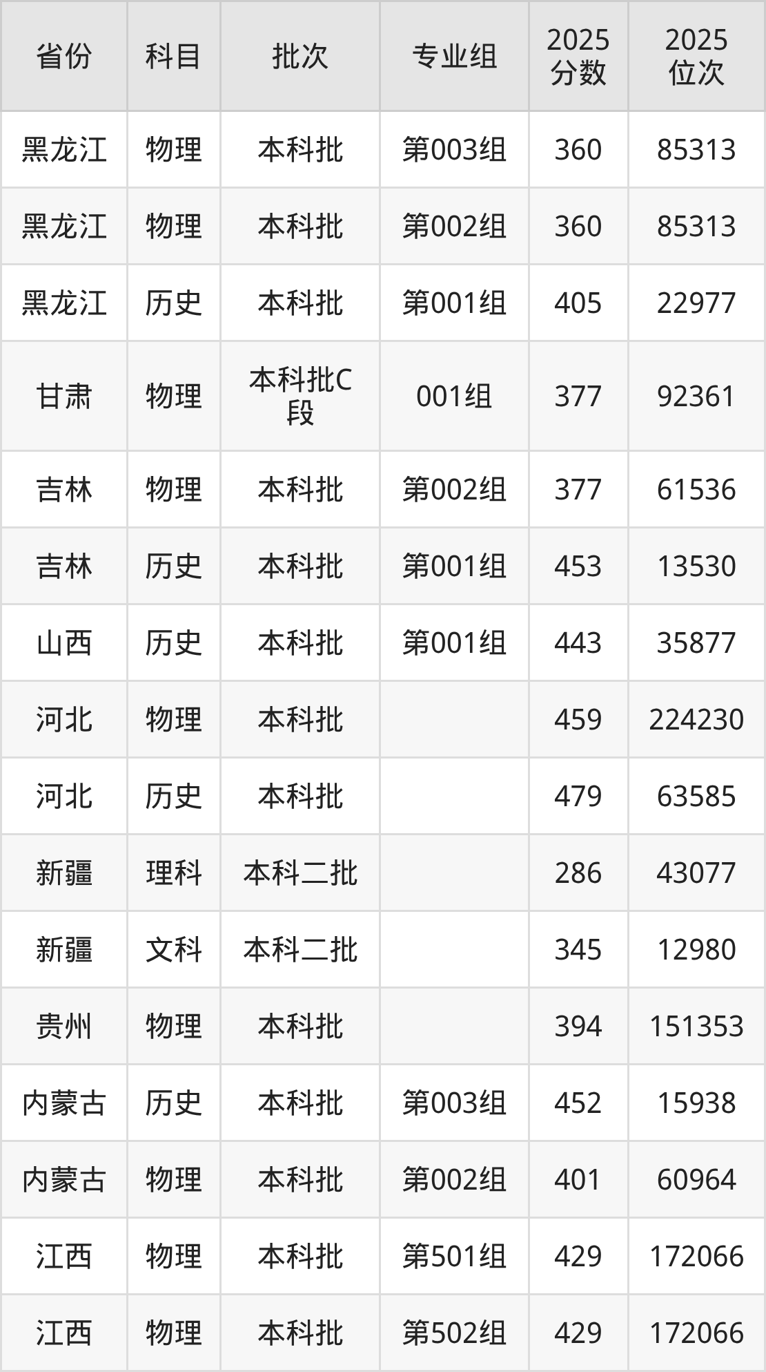 2025年在本科物理类进行招生,各专业组分数线详情如下:
