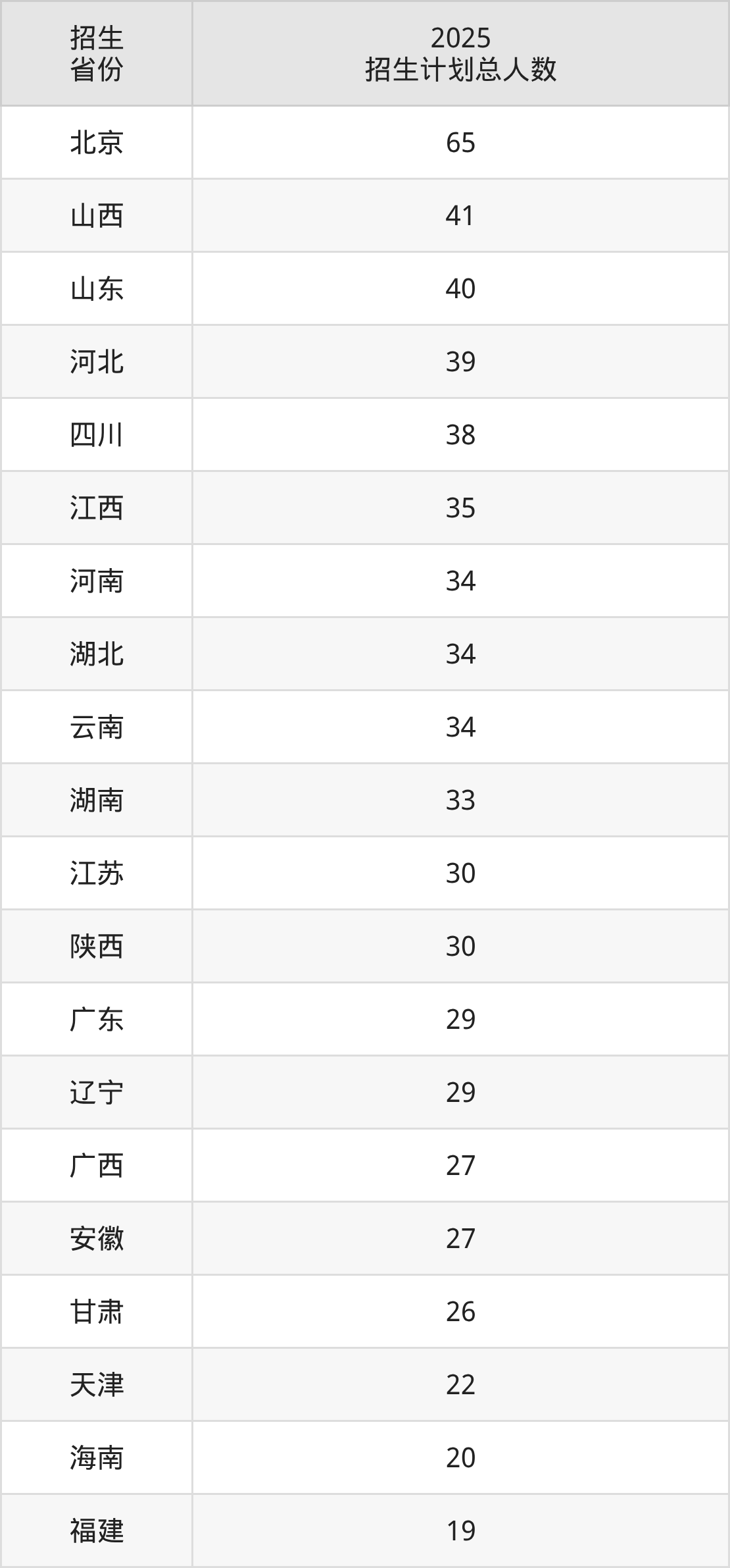 2025年北京体育大学面向全国29个省市开展本科招生;招生专业共15个,招生人数共753人。2025年在北京市招生计划总人数是65人,其中,北京体育大学在北京市招生人数最多的是休闲体育。北京体育大学在各省具体招生人数情况如下表。