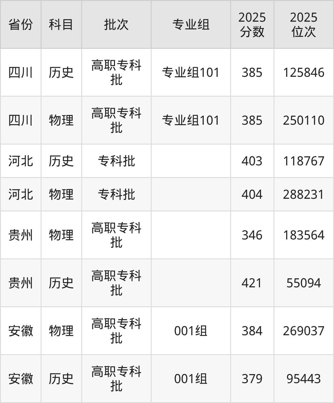 2025年安徽电子信息职业技术学院全国录取分数线是346分到428分,录取最低在贵州物理类、录取最高在河北历史类。各省各专业组最低分具有差异,详情如下: