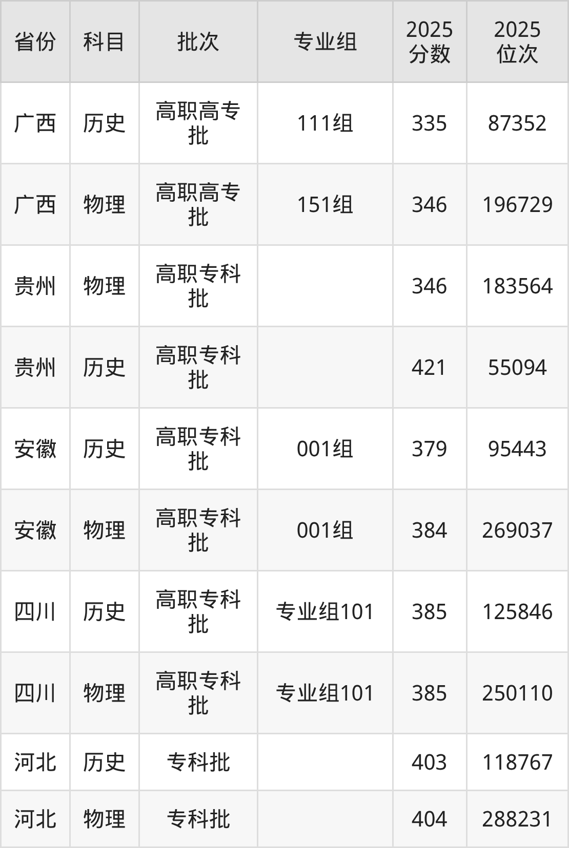 2025年安徽电子信息职业技术学院全国录取分数线是335分到421分,录取最低在广西历史类(111组)、录取最高在贵州历史类。各省各专业组最低分具有差异,详情如下: