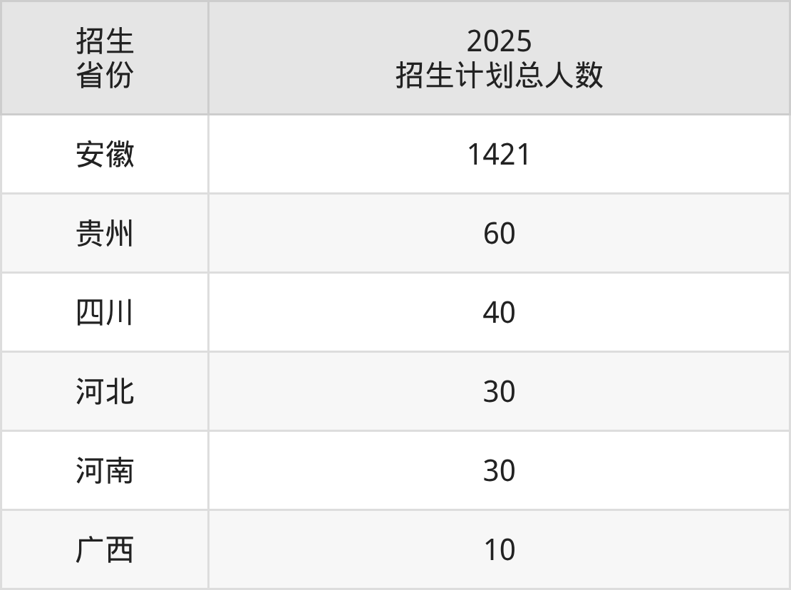 2025年安徽电子信息职业技术学院面向全国6个省市开展专科招生;招生专业共33个,招生人数共1591人。2025年在安徽省招生计划总人数是1421人,其中,安徽电子信息职业技术学院在安徽省招生人数最多的是计算机应用技术。安徽电子信息职业技术学院在各省具体招生人数情况如下表。