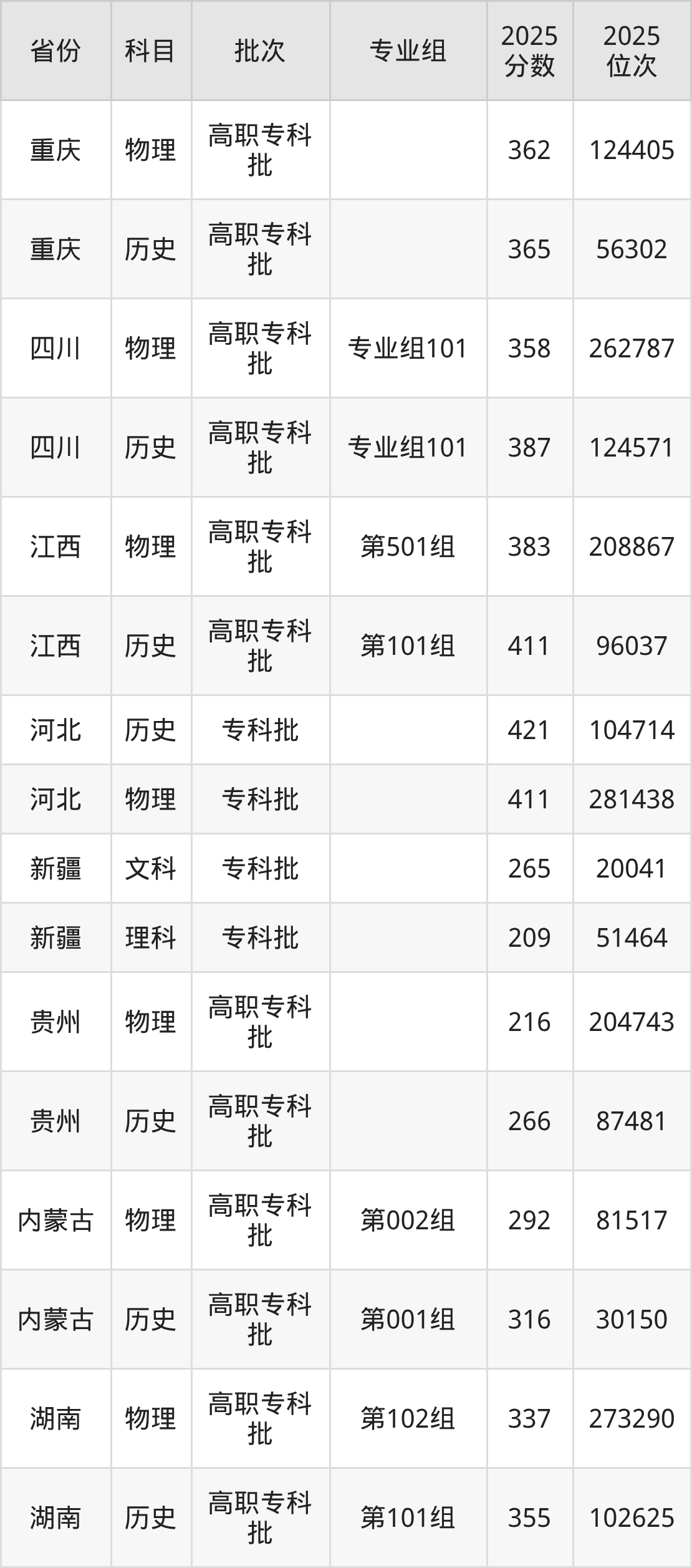 普通类专科物理类最低383分,专科历史类最低411分