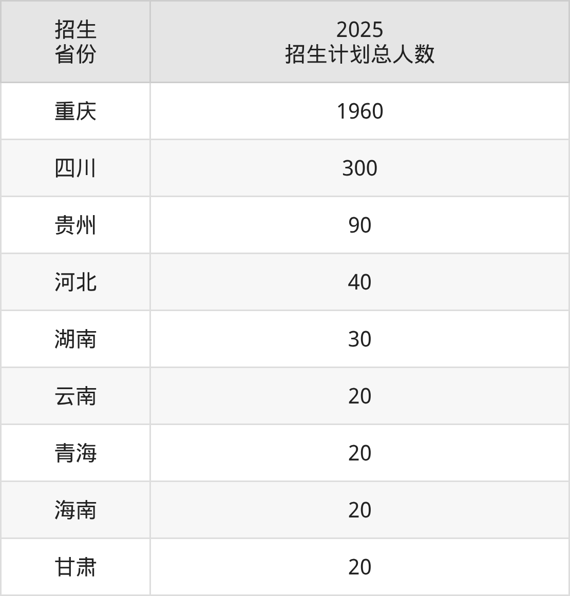 2025年重庆五一职业技术学院面向全国9个省市开展专科招生;招生专业共18个,招生人数共2500人。2025年在重庆市招生计划总人数是1960人,其中,重庆五一职业技术学院在重庆市招生人数最多的是智能制造装备技术。重庆五一职业技术学院在各省具体招生人数情况如下表。