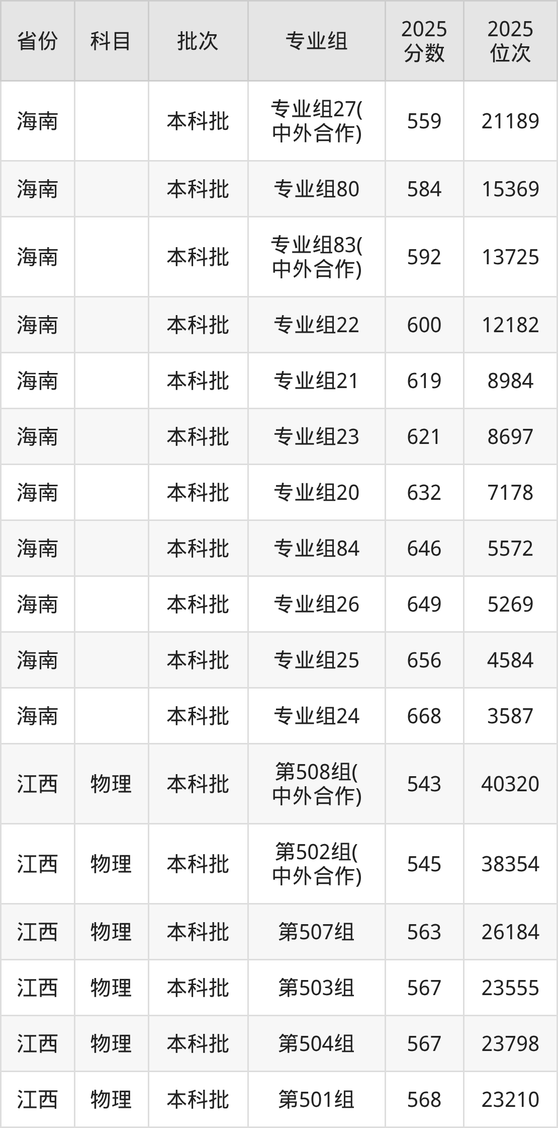 海南大学007专业组(中外合作办学):2025年投档录取最低分为499分,录取最低位次为29036名。
