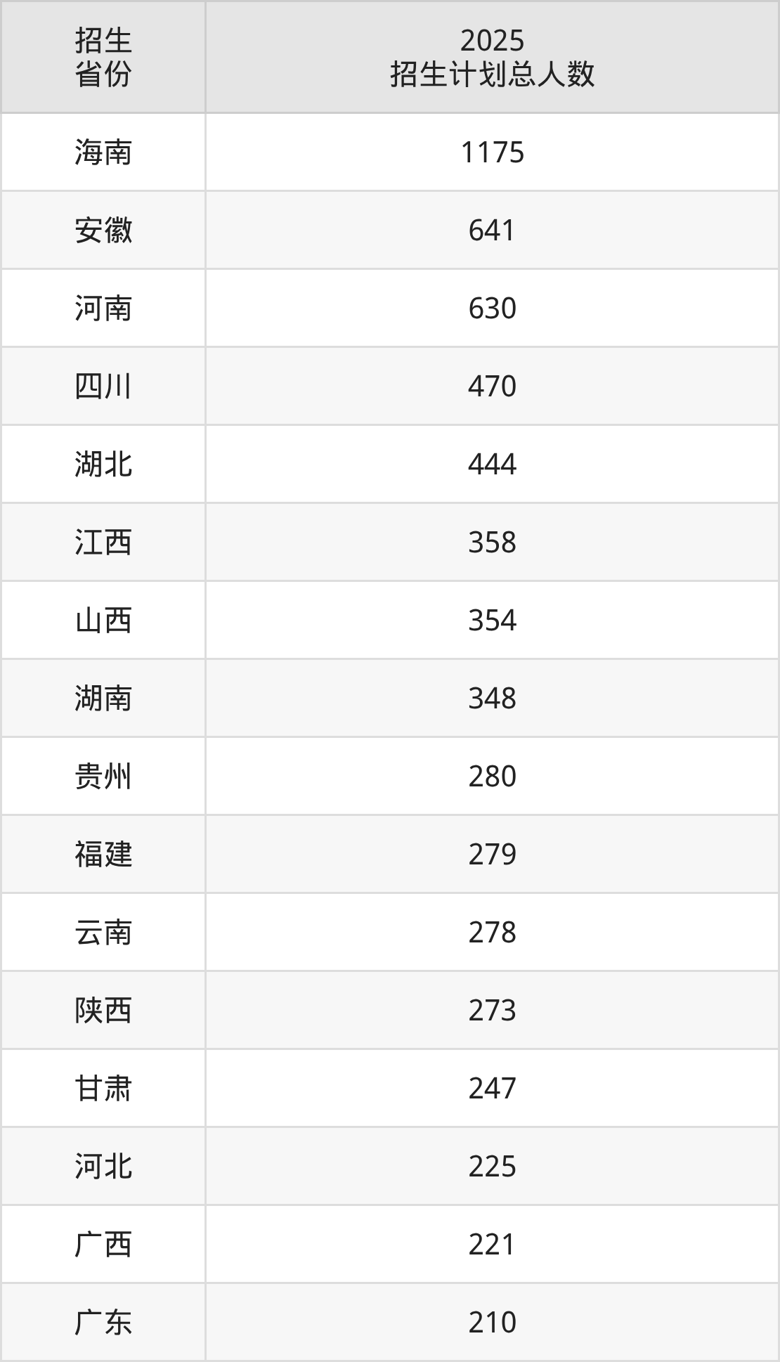 2025年海南大学面向全国28个省市开展本科招生;招生专业共74个,招生人数共7418人。2025年在海南省招生计划总人数是1175人,其中,海南大学在海南省招生人数最多的是乡村治理。海南大学在各省具体招生人数情况如下表。